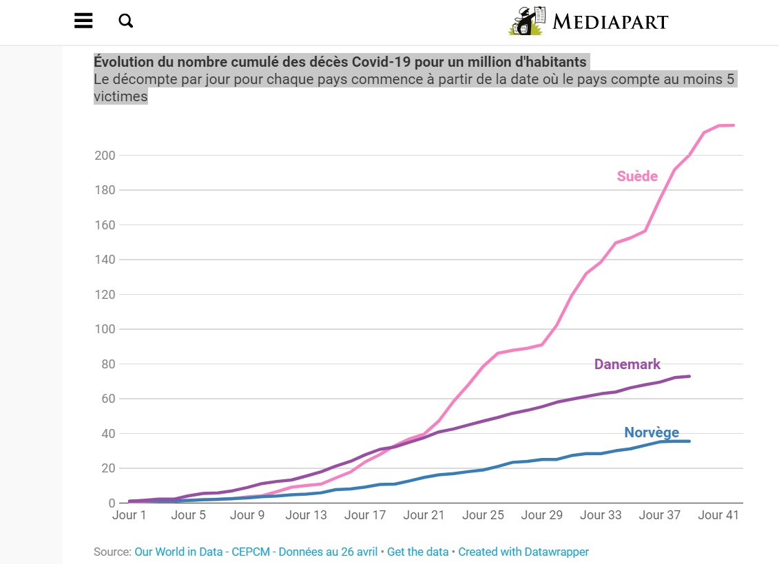 L'efficacité de ce ratio apparaît également incontestable lorsque Mediapart, le 28 avril, décide dans un article plus général de l’utiliser afin de tordre le cou à l’idée, très répandue ces dernières semaines dans les médias, que l’absence de confinement en Suède démontrerait la faible utilité de cette mesure dans les autres pays européens. "Une décision de plus en plus critiquée alors que le bilan humain suédois dépasse désormais celui de ses voisins danois et norvégien, comme l'établit le graphique ci-dessous", pointe Mediapart, courbe à l’appui.