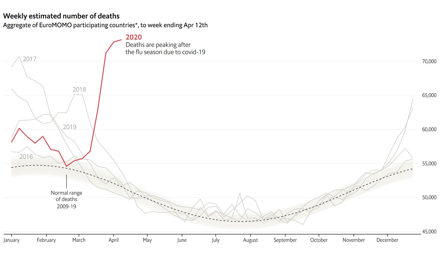 Selon The Economist, du 10 mars au 13 avril, 86 % de la surmortalité française a ainsi été attribuée à des décès du Covid-19, et un pourcentage approchant a été calculé par Mediapart -même si le New York Times semble disposer d’autres chiffres de surmortalité et fait ainsi état d’un différentiel de 39 %. Au Royaume-Uni, de loin le pays européen à la surmortalité la plus élevée et l’un des plus mauvais élèves en matière de fiabilité des données officielles, plus de la moitié de cette mortalité en excès par rapport à la moyenne habituelle n’est pas comptabilisée comme étant due au Covid-19. Ces nouvelles comparaisons montrent aussi sans équivoque l’ampleur des décès liés à l’épidémie. "Compte tenu des signaux dramatiques de mortalité que nous observons déjà, particulièrement dans certaines régions européennes, nous pouvons conclure que cette pandémie n’est pas juste une autre grippe – pas du tout", analyse ainsi l’épidémiologiste danois coordinateur de la base de données EuroMOMO, Lasse Skafte Vestergaard.