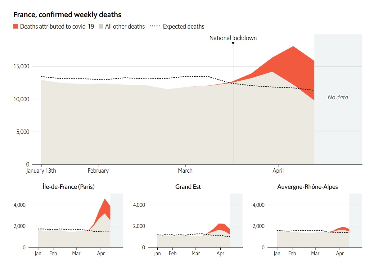 Il a fallu plusieurs semaines avant que les médias commencent à douter des déclarations de chaque pays concernant les morts. The Economist a eu une influence déterminante en s’interrogeant sur la fiabilité des données dès le 4 avril. Il le fait à partir d'un minutieux travail journalistique réalisé sur certaines localités en France, en Espagne et en Italie, respectivement par NextInpact, El Pais et le Corriere della Serra. "Le total des décès dus au Covid-19 semble plus élevé que ne le suggèrent les bilans officiels", titrait l’hebdomadaire anglais. "Ceux-ci excluent les victimes non testées avant de mourir. Cela prend souvent plusieurs jours pour établir et communiquer la cause des décès, causant un retard dans les données. Et si les hôpitaux sont surchargés, les gens souffrant d’autres problèmes pourraient ne pas bénéficier des soins intensifs dont ils auraient eu besoin pour survivre", explique le journal. Mais l’article de début avril n’a qu’un retentissement très limité. Le second, beaucoup plus détaillé, publié le 16 avril, a fait, lui, le tour du monde. The Economist diffuse en effet des comparaisons entre les données de surmortalité issues de sources fiables, comme la base de données européenne de décès EuroMOMO, et les bilans officiels dans de nombreux pays et régions, dont la France. Il est rapidement imité par le New York Times, le Financial Times, Mediapart, ou Les Échos (qui note un "défaut de statistiques" à ce sujet en Allemagne), entre autres.