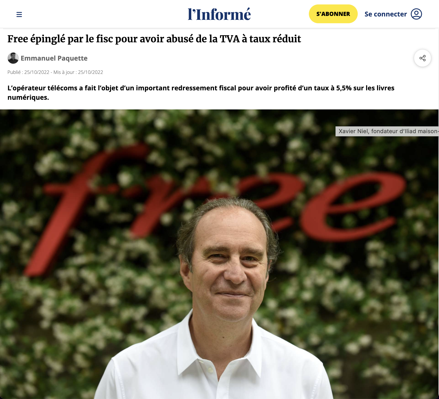 "Xaviel Niel aurait-il joué au plus malin avec Bercy ?" La question est posée par le journaliste Emmanuel Paquette dans un article paru le 25 octobre, intitulé "Free épinglé par le fisc pour avoir abusé de la TVA à taux réduit". Le trésor public a réclamé, selon les informations du journaliste, 43 millions d'euros au groupe de télécommunications. Amende dont Free s'est acquitté, avant de saisir le tribunal administratif pour récupérer son argent. "L'opérateur télécoms a fait l'objet d'un important redressement fiscal pour avoir profité d'un taux à 5,5 % sur les livres numériques", précise le papier.