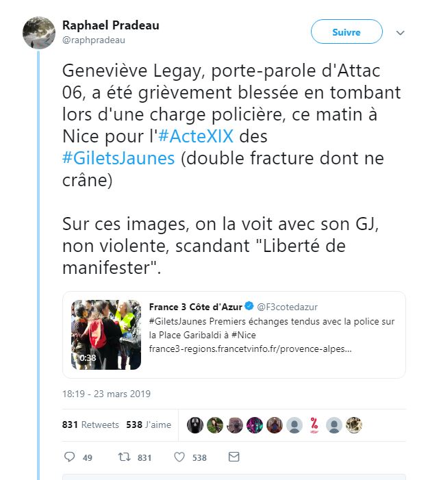 explique qu’une militante est tombée, “blessée finalement sans gravité”.
