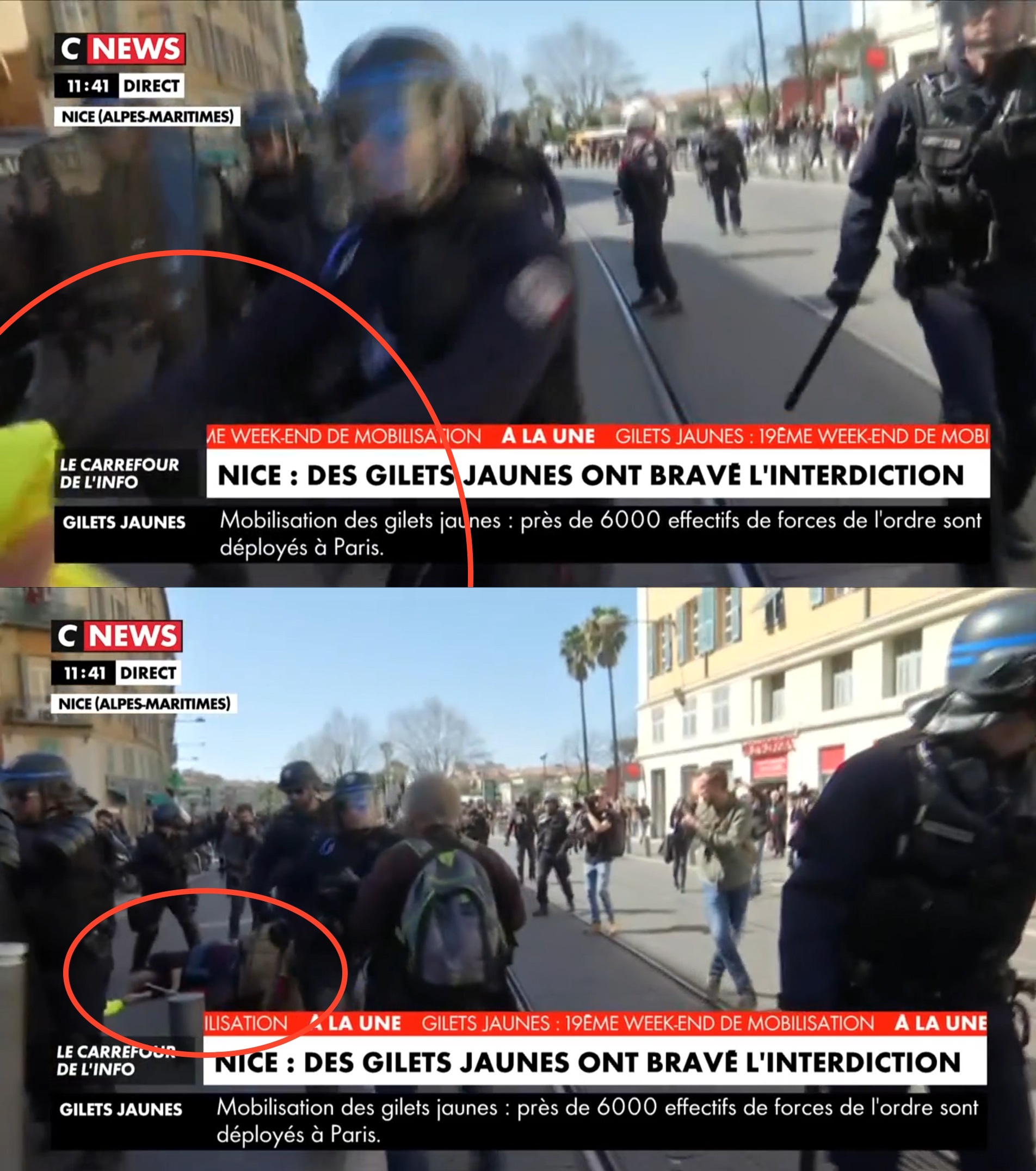 . Pour aucun de ces duplex, CNEWS n'utilise l’image de la charge policière qui a causé les multiples fractures de Geneviève Legay, pourtant diffusée en temps réel sur la chaîne.