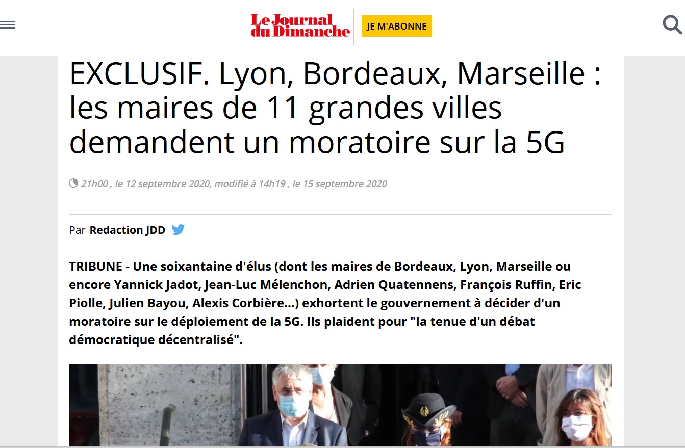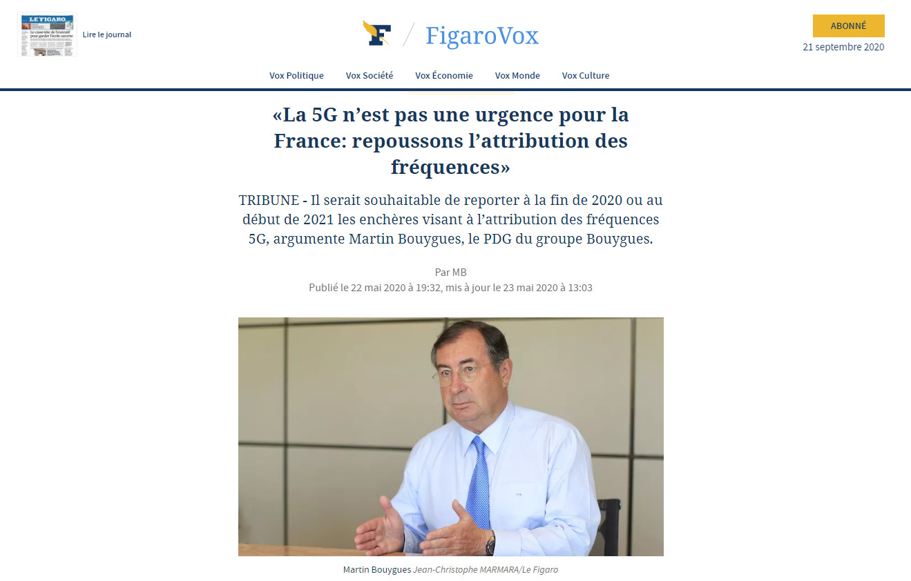 Le 12 septembre, dans le JDD, une soixantaine d'élus de gauche dont 11 maires écologistes demandaient un moratoire sur le déploiement de la 5G "au moins jusqu'à l'été 2021". Ils voulaient permettre "la tenue d'un débat démocratique décentralisé sur la 5G et sur les usages numériques", et que "la priorité soit donnée à la réduction de la fracture numérique" avec "le développement de la fibre en zone rurale et en finalisant le déploiement de la 4G". Le 14 septembre, Emmanuel Macron moquait ses signataires, mais aussi les participants à la Convention citoyenne pour le climat qui ont proposé un moratoire "en attendant les résultats de l’évaluation de la 5G sur la santé et le climat" avant l'été. "Oui, la France va prendre le tournant de la 5G", s'était-il en effet enthousiasmé devant un public d'investisseurs et de patrons de la tech, qualifiant de "modèle amish" la position pro-moratoire. Mais le président de la République n'a pas répondu lorsque Martin Bouygues, le 22 mai, a demandé lui aussi un décalage de l'attribution des fréquences –prévue à la fin du mois–, en usant d'arguments certes économiques, mais en évoquant aussi la nécessité d'un débat public et citoyen.