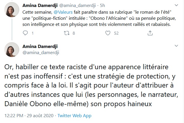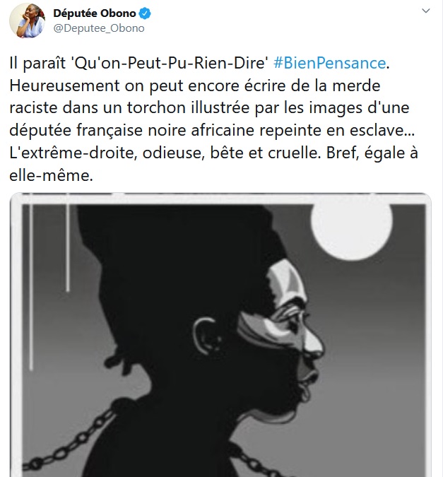 attentif. Le texte sur Obono est en effet marqué par des réflexions hallucinantes de racisme et de mépris, la plupart du temps énoncées comme des pensées de la députée elle-même, devenue esclave, ou de personnages du récit intitulé "Obono l'Africaine". Lui faisant évoquer la "négritude", l'auteur écrit qu'elle "ne savait pas que [Christiane Taubira] avait emprunté le concept à Aimé Césaire". Une réflexion d'Obono sur "l'africanité" est immédiatement suivie par "la pensée des cafards qui grouillaient autour d'elle dans l'obscurité malodorante", là "où il lui fallait sacrifier à des besoins immémoriaux". Le texte semble constituer une sorte de chemin de Damas pour la députée, qui abandonne progressivement ses idéaux politiques, finissant par voir la lumière lorsqu'elle revient en France après avoir été rachetée par un moine à son maître.