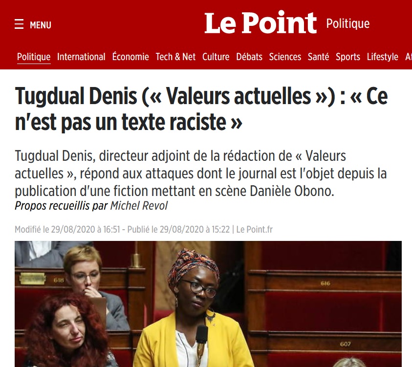 Chez Valeurs actuelles, face à l'ampleur de la polémique, la fiction raciste est d'abord assumée. " 'Merde raciste' ? Il s’agit d’une fiction mettant en scène les horreurs de l’esclavage organisé par des Africains au 18e siècle...", répond le 28 août l'hebdomadaire à Obono. "Inventer du 'nauséabond' dans une fiction relatant les atrocités de l’esclavage commis par des Africains il y a 3 siècles relève au mieux de la mauvaise foi, au pire de la manipulation. Reprenez vos esprits et apprenez à lire", enchaîne-t-il à l'égard de Mélenchon. Samedi 29 août, le ton change radicalement. Le directeur adjoint de la rédaction Tugdual Denis présente ses excuses à Obono à l'antenne de BFMTV, et ajoute : "Je regrette qu'on ait pu penser qu'on soit raciste." Dans la foulée, il a donné une interview –aux questions compréhensives– au Point, et l'hebdomadaire a publié un communiqué réitérant l'absence de racisme du texte tout en s'excusant auprès de la députée.
