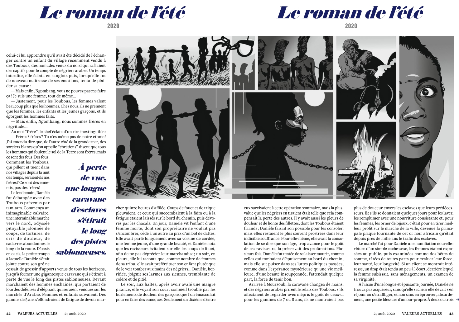 Cette fois-ci, Valeurs actuelles n'a pu se protéger derrière le paravent des idées : la condamnation de son dernier "roman de l'été", à l'auteur anonyme, théoriquement fictionnel et publié exclusivement dans l'édition papier (comme tous les autres de ces séries estivales lancées en 2019), est unanime au sein de la classe politique et journalistique. Parues jeudi 27 août, ces 7 pages ramenant la députée LFI Danielle Obono au rang d'esclave dans une Afrique du 18e siècle, telle que fantasmée par l'hebdomadaire d'extrême-droite, ne ménagent pas leur racisme. Les réactions se sont cependant plutôt focalisées sur une illustration montrant la parlementaire enchaînée par le cou. La polémique dépassera-t-elle les controverses auxquelles le magazine est habitué avec ses Unes, pour se solder par une procédure en justice - à l'instar de la condamnation confirmée en appel après une couverture sur les Roms ?