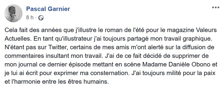L'illustrateur non-anonymisé de toutes les séries d'été du magazine, Pascal Garnier, a assuré sur sa page Facebook, dans un étrange rétropédalage, avoir exprimé directement à Obono sa "consternation" et avoir "toujours milité pour la paix et l'harmonie entre les êtres humains" – il n'a pas répondu à la sollicitation d'ASI. Le 27 août, jour de la publication de Valeurs actuelles, il se réjouissait pourtant sur la même page, dans des publications désormais supprimées, de la "transgression" représentée par son dessin d'une "Danièle Obono enchaînée", ou par l'aspect "délicieusement provocateur" d'une "Danièle Obono sauvée de l'esclavage par le christianisme". Et s'adressait à l'hebdomadaire en des termes bien différents de ceux utilisés ce 29 août : "Merci à Valeurs actuelles de m'avoir encore cet été confié cette liberté d'illustrer."