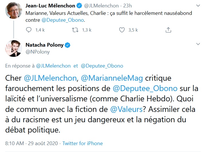 Même dilemme à l'hebdomadaire Marianne, ayant été nommément désigné dans la réprobation de Jean-Luc Mélenchon aux côtés de Charlie Hebdo et de Valeurs actuelles : "Ça suffit le harcèlement nauséabond", avait-il en effet publié sur Twitter. "Marianne critique farouchement les positions de la députée Obono sur la laïcité et l’universalisme (comme Charlie Hebdo). Quoi de commun avec la fiction de Valeurs ? Assimiler cela à du racisme est un jeu dangereux et la négation du débat politique", répondait dans un premier temps la directrice de sa rédaction Natacha Polony, n'évoquant que dans un second temps le "fantasme raciste" publié par l'hebdomadaire concurrent.
