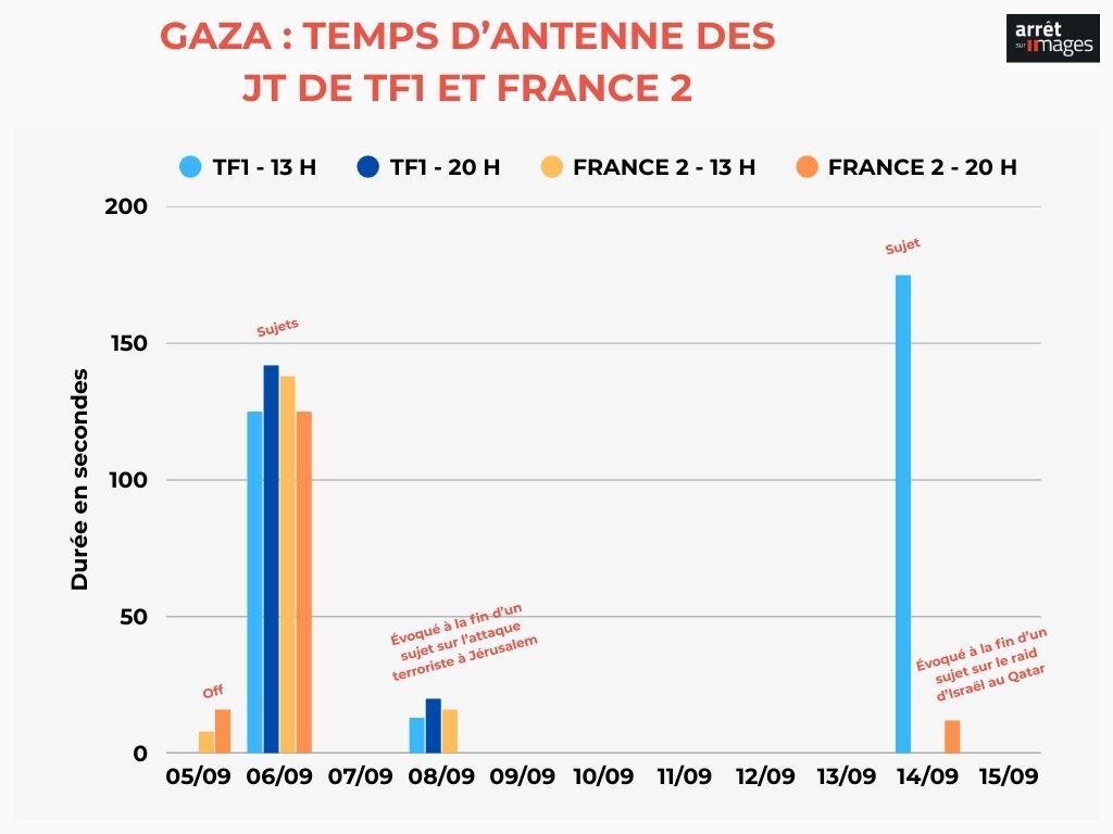 Le 5 septembre, le JT de 13h de France 2 consacre huit secondes à Gaza ("il y a quelques instants, l'armée israélienne a annoncé avoir frappé une tour d'immeubles dans la ville de Gaza"