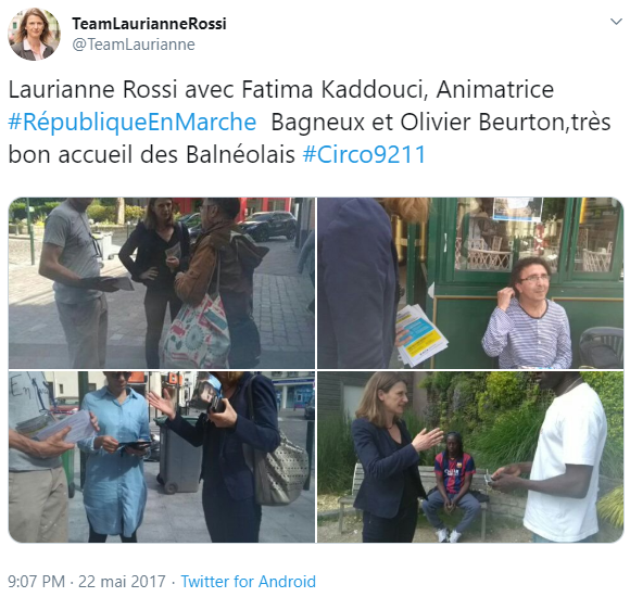 Mais Olivier Beurton, qui a eu le courage de renoncer à ses stock options pour le risque d'une vie d'entrepreneur à 80 000 euros net par an, n'est pas seulement un plombier particulièrement bien loti. Il est aussi -et il n'en est pas question dans le sujet radio de France info-, adhérent de La république en marche. LREM étant un mouvement, et non un parti, "adhérent" veut simplement dire qu'il s'est inscrit, gratuitement, sur une sorte de newsletter. Toutefois, Beurton est allé plus loin dans son soutien au mouvement d'Emmanuel Macron. Comme plusieurs personnes l'ont repéré sur Twitter, on le retrouve, en 2017, sur des photos de tractage pour la candidate LREM (victorieuse) dans les Hauts-de-Seine, Laurianne Rossi.