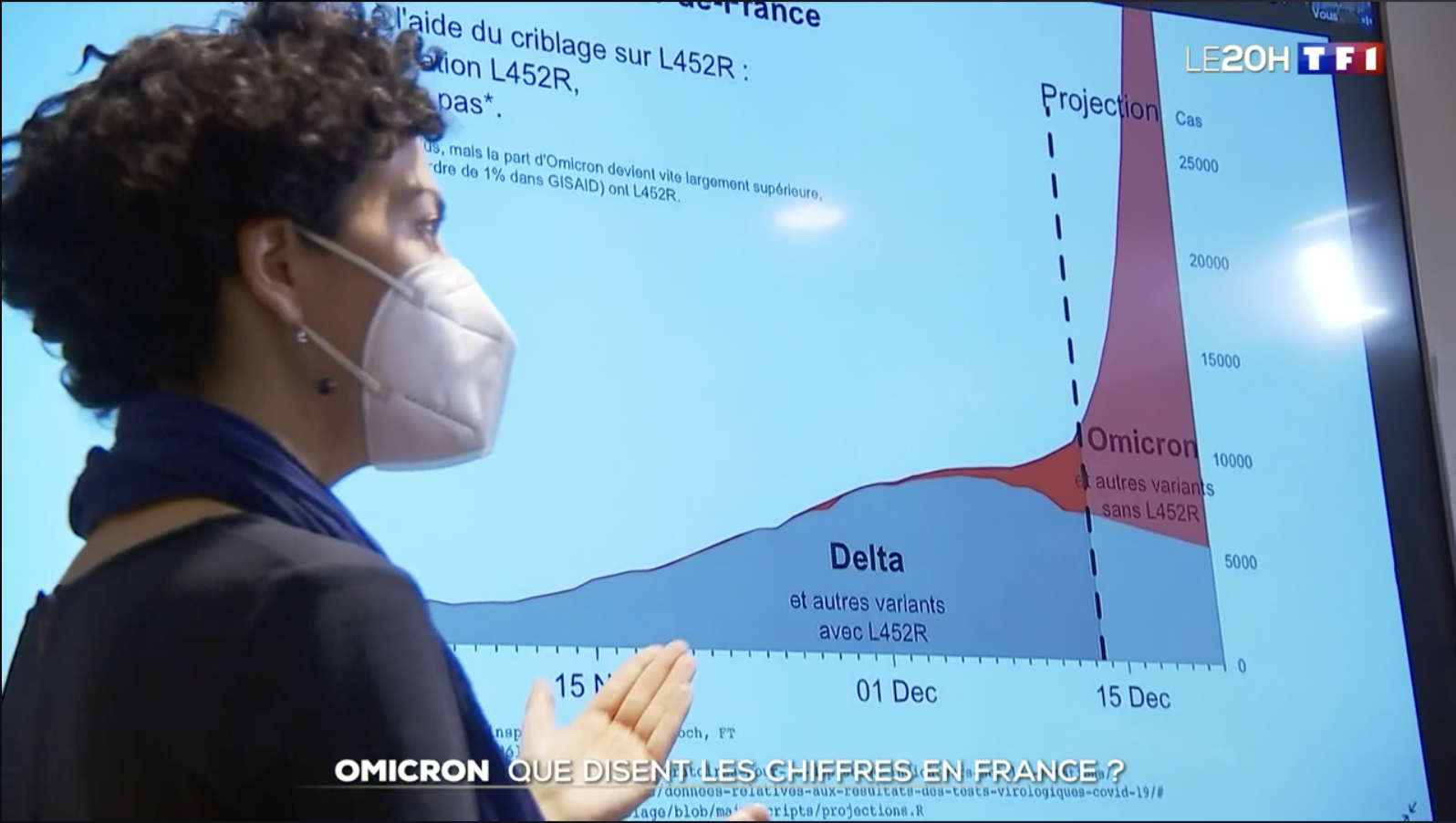 Pour TF1, afin de rendre visuelle la hausse probable des cas Omicron en France, elle utilise un schéma de son cru inspiré des graphiques britanniques. Bien que ce soit une projection, elle a ajouté des graduations, ce qui donne l'impression, regrette-t-elle trois jours plus tard sur Twitter, que c'est une prédiction rigoureuse et non une simple projection. "Il y a toujours une tension entre la prudence des scientifiques et le besoin de clarté et de simplicité des journalistes, et je me suis laissée emporter vers trop de simplicité"