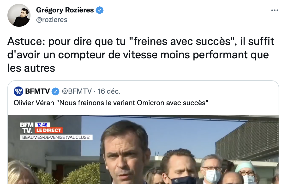 Or les 200 cas en question sont issus du séquençage : ils remontent donc à environ une semaine, alors que les cas Omicron doublent tous les trois jours si l'on en croit les chiffres du Royaume-Uni… Olivier Véran pourrait mentionner des chiffres plus réalistes issus du criblage, mais ne le fait pas. Grégory Rozières tweete l'interview avec ironie (voir ci-dessous).
