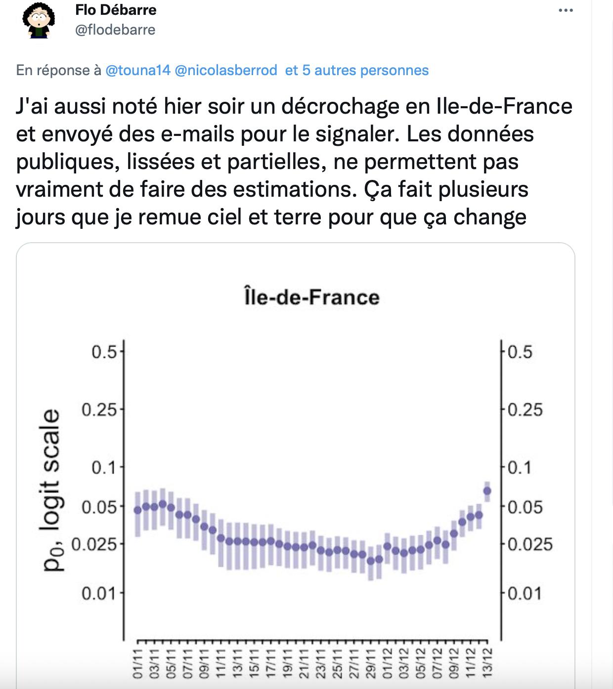 . Il détaille ce qui peut faire penser que l'augmentation des cas franciliens correspond à l'arrivée d'Omicron. Et conclut : "Santé publique France affirme regarder «les indicateurs en données quotidiennes», mais n'a pas donné plus de détails sur la situation actuelle, renvoyant au prochain point épidémiologique hebdomadaire, qui sera publié entre le 23 et le 24 décembre. Face à un variant qui, dans les autres pays, double tous les 3 jours, la pertinence d'un suivi hebdomadaire pose question."