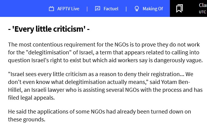 outient une lutte armée menée par un État ennemi" ou si elle "mène des campagnes de délégitimation contre l'État d'Israël". Autrement dit, tout le plaidoyer mené par les ONG, dont une partie du travail repose sur le travail d'information et d'influence auprès des décideurs politiques et du grand public, concernant la réalité humanitaire à Gaza.