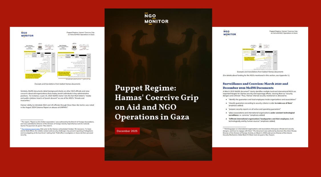 Régime fantoche : l'emprise coercitive du Hamas sur l'aide humanitaire et les opérations des ONG à Gaza". NGO Monitor est un groupe de pression pro-israélien, créé pour promouvoir et défendre des intérêts. Il est régulièrement sous le feu des critiques. En octobre 2024, Le Monde rappelait notamment que l'organisation cherchait à "
