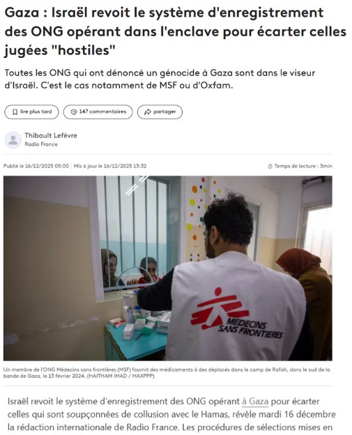 dans son magazine deux articles "Comment le Hamas a infiltré les ONG occidentales à Gaza" et "Gaza : l'Europe sommée de durcir ses contrôles sur le financement des ONG", tous deux publiés en ligne le 22 décembre, suivis d'une vidéo.