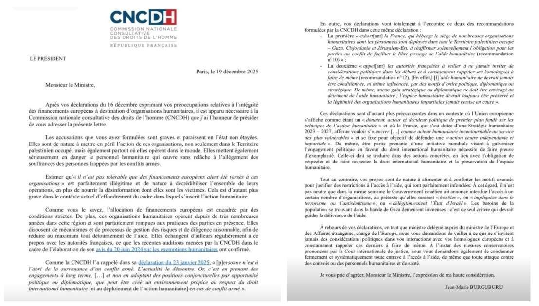 Un document sur lequel s'est appuyé le ministre français chargé de l'Europe, Benjamin Haddad, qui s'inquiétait, le 9 décembre, de potentiels détournements de fonds des ONG au profit du Hamas. Suite à quoi, la Commission nationale consultative des droits de l'Homme (CNCDH) a réagi dans une lettre adressée au ministre, le 19 décembre, dénonçant des accusations "