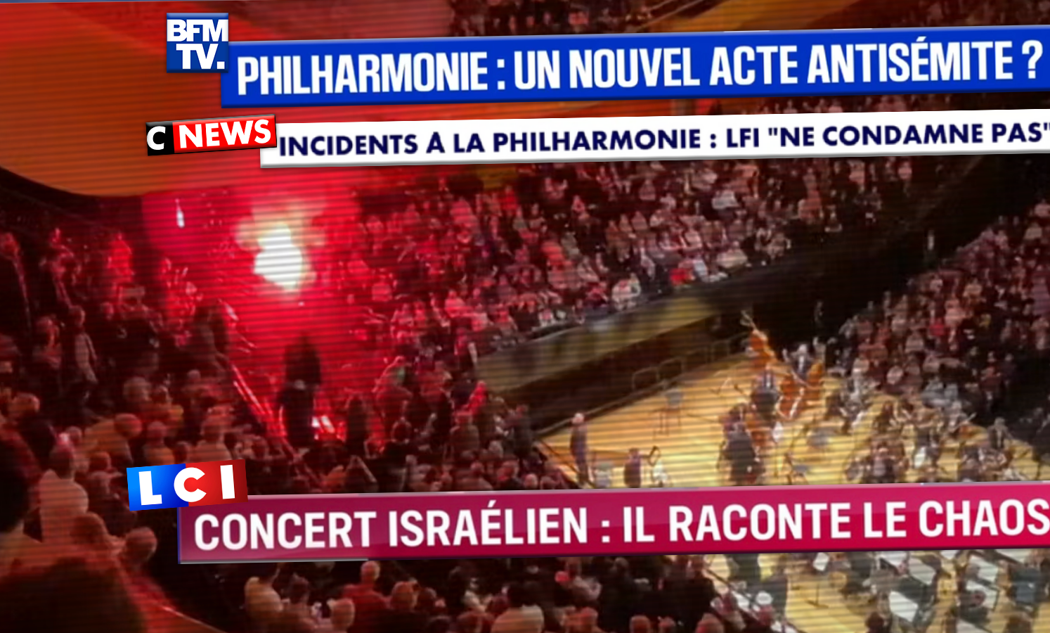 Comme la direction de la Philharmonie s'y attendait (ce que nous a confirmé un agent d'accueil qui y travaillait ce soir-là), le concert a été perturbé à plusieurs reprises par des actions de trois militants pro-palestiniens de Palestine Action France....
