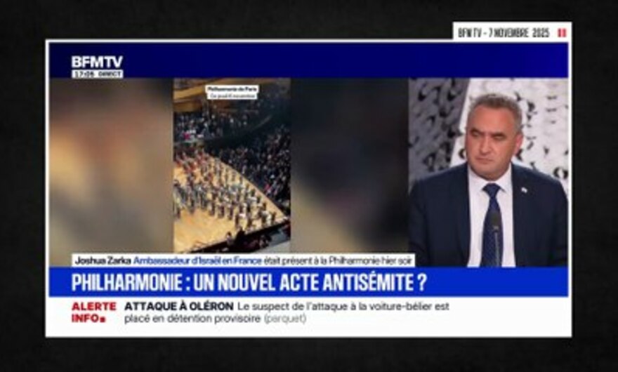 Toujours sur la chaîne d'opinion, l'ambassadeur israélien, Joshua Zarka, semble aussi justifier cette violence : "Ce qu'on voit sur ces images, on voit ces membres de l'audience taper ce monsieur, je pense que les Français en ont assez de cette instrumentalisation cynique