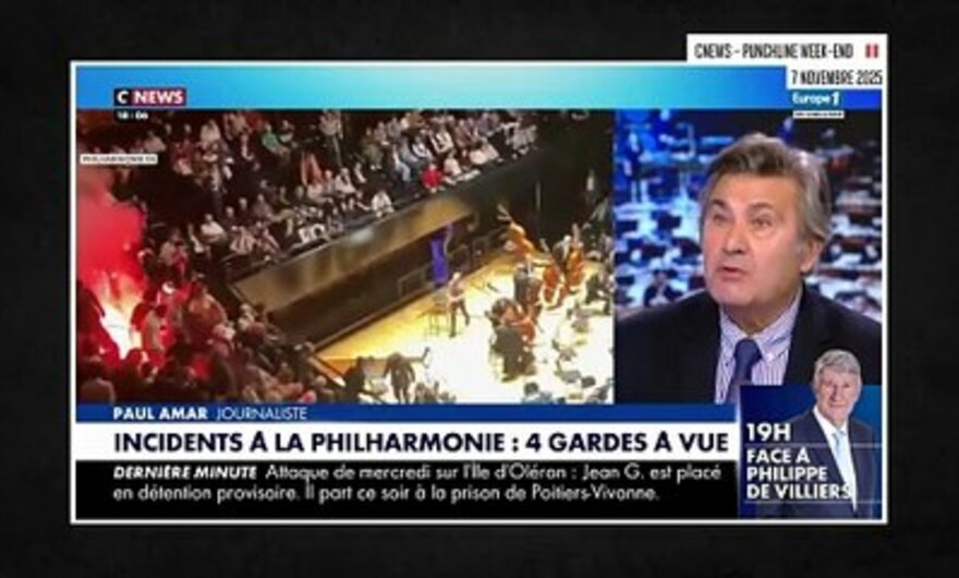 . Laurence Ferrari (qui était présente dans la salle de la Philharmonie ce soir-là) rapporte (par téléphone) sur CNews que "les massacres du Bataclan"