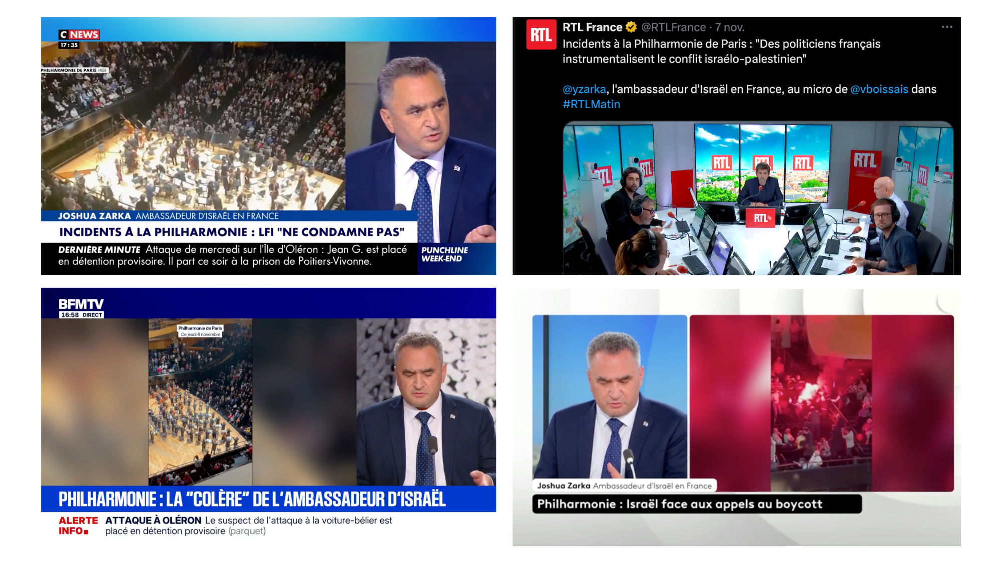 L'ambassadeur d'Israël, Joseph Zarka a, de son côté, été invité sur CNews, BFM, RTL ou encore France Info. Partout, le diplomate peut dérouler sa communication sans jamais être contredit ou relancé, par exemple lorsqu'il affirme que "la guerre (à Gaza - ndr) est terminée"