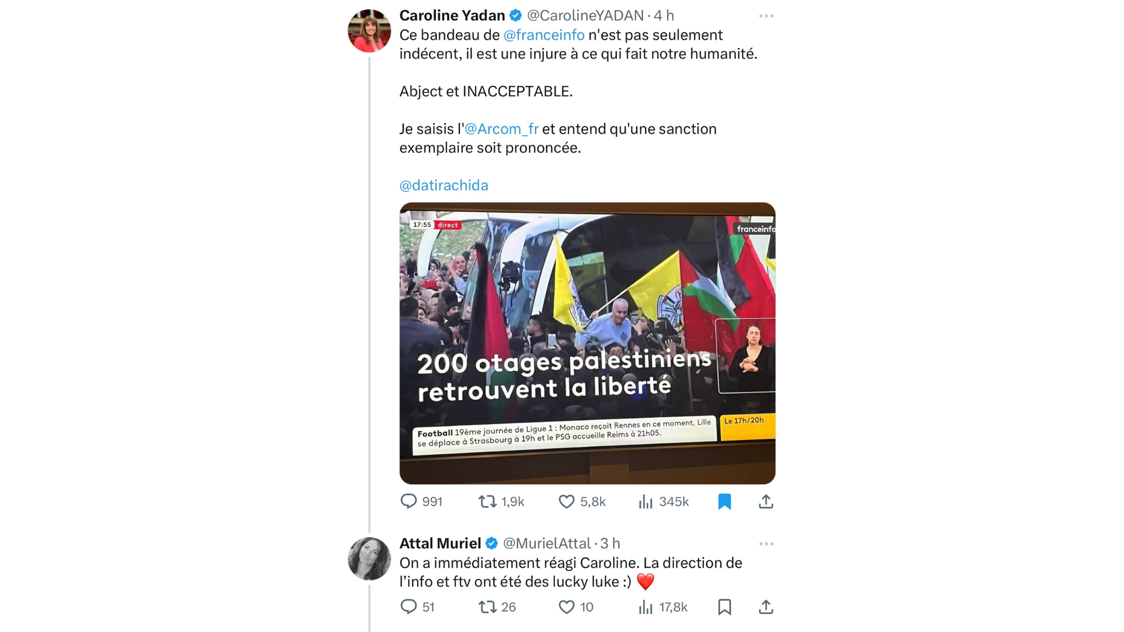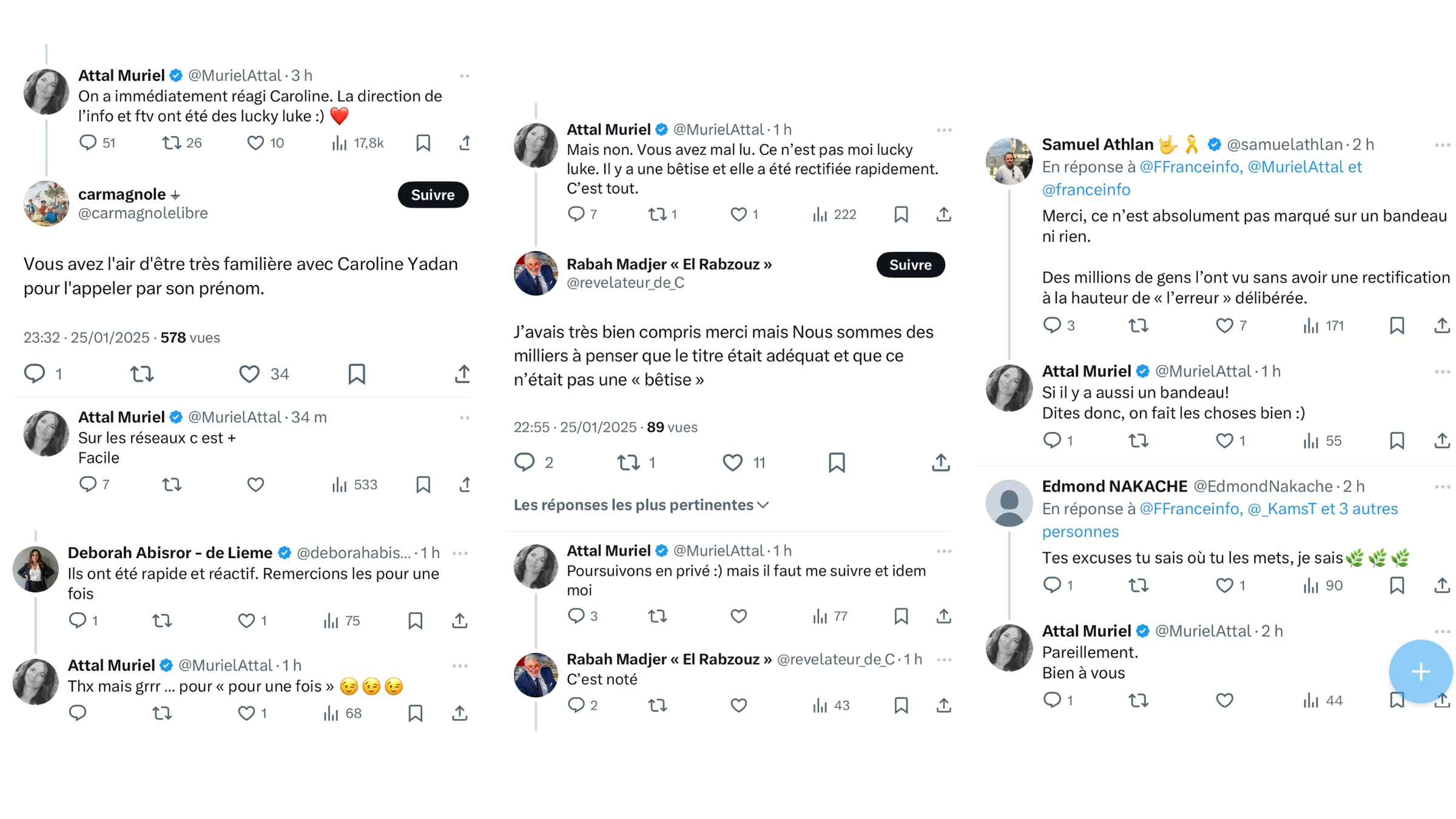 L'emballement aurait pu s'arrêter là. C'est alors que la directrice de la communication du groupe France Télévisions, Muriel Attal, entre en scène. À 21h09, sur son compte X, elle répond publiquement à la députée des Français de l'étranger : "On a immédiatement réagi Caroline. La direction de l’info et ftv ont été des lucky luke :)"