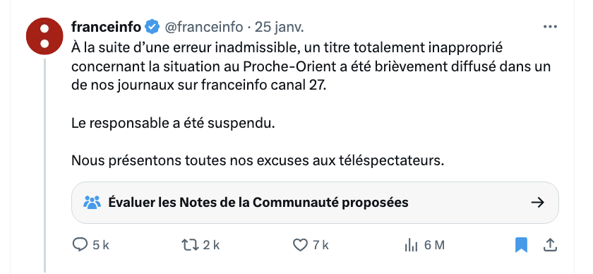 Moins d'une heure après ce tweet, le compte X @franceinfo publie des excuses suite à une "erreur inadmissible"