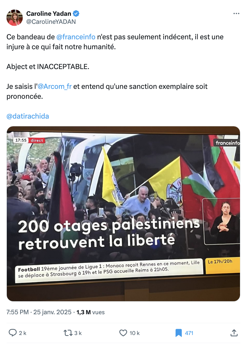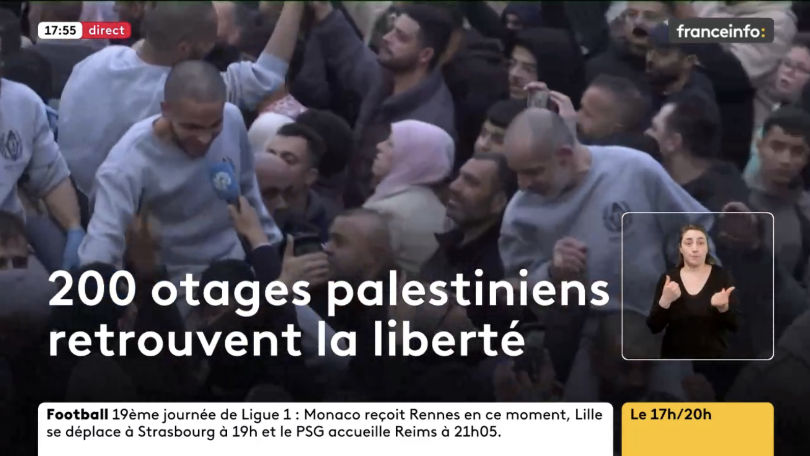 Ce samedi 25 janvier, à 17h55, la journaliste Cécile Bartoli déroule les différentes actualités du jour tandis que les titres apparaissent à l'écran sous forme de texte "à l'image" dans le jargon. Alors qu'elle évoque la libération des 4 soldates israéliennes capturées par le Hamas le 7 octobre contre celle de 200 prisonniers palestiniens, le titre affiche "200 otages palestiniens retrouvent la liberté"