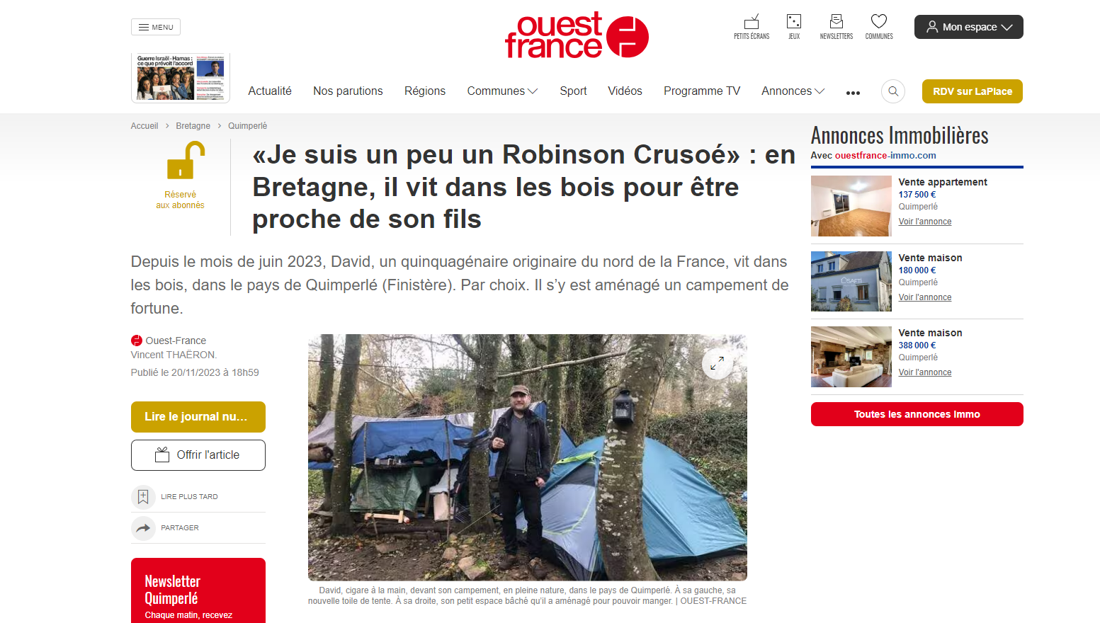 Bien sûr, une référence à Robinson Crusoé, ça donne envie de cliquer. "«Je suis un peu Robinson Crusoé» : en Bretagne, il vit dans les bois pour être proche de son fils", clame le titre de l'article d'Ouest-France. Nous sommes dans la forêt de Kervec, tout près de Quimperlé dans le Finistère, et ce Robinson-là s'appelle en réalité David. Sur la photo qui illustre l'article, il pose "un cigare à la main, devant son campement en pleine nature".