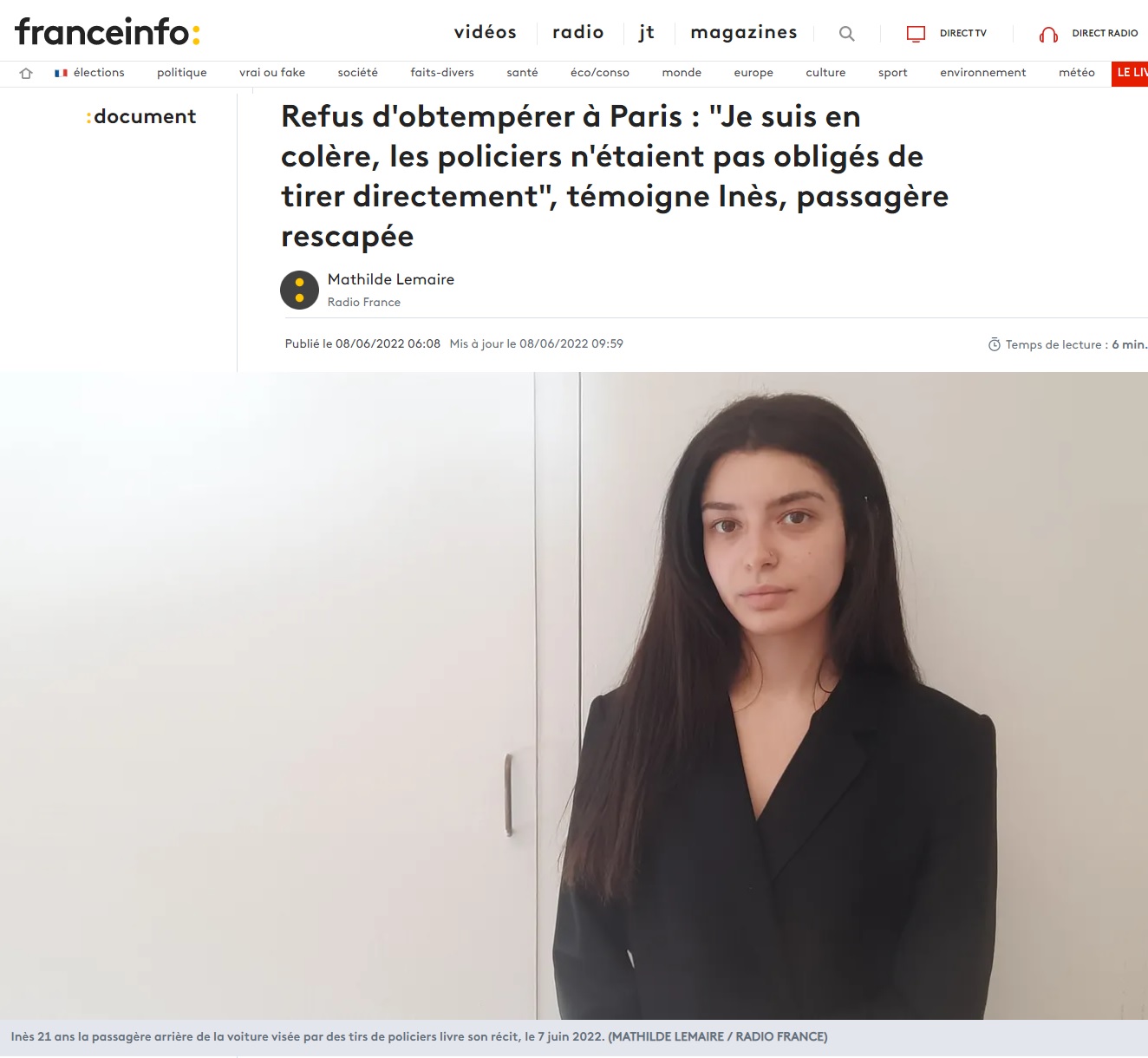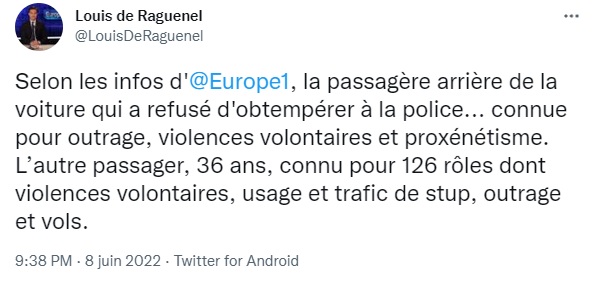 Le 8 juin, la police souffle également à l'oreille d'Europe 1, qui répète (et complète) les informations de BFMTV sur le casier des passagers. Cette fois, c'est Inès, l'amie de Rayana, qui en est le sujet : "Selon les informations d'Europe 1, la passagère arrière, Inès Z., est connue pour outrage, violences volontaires et proxénétisme,"