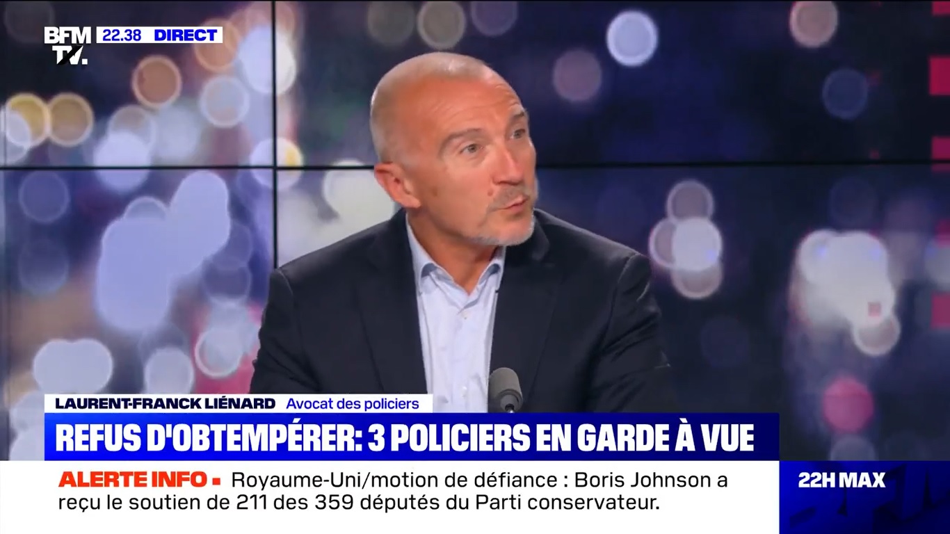 Toujours sur BFMTV, le 6 juin au soir, arrive l'avocat Laurent-Franck Liénard, qui représente les trois policiers dans cette affaire – ainsi que les policiers qui ont tué la passagère d'une voiture sur le Pont-Neuf à Paris, dans des circonstances analogues, mais cela ne sera précisé qu'en fin d'interview. Liénard va rester en plateau pendant près de 45 minutes. Tirer est "un ultime recours pour un policier"