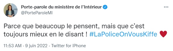 Le poste de télévision de la porte-parole du ministère de l'Intérieur Camille Chaize était peut-être branché sur BFMTV lorsqu'elle a choisi de soutenir la police avec un hashtag, #LaPoliceOnVousKiffe. ASI