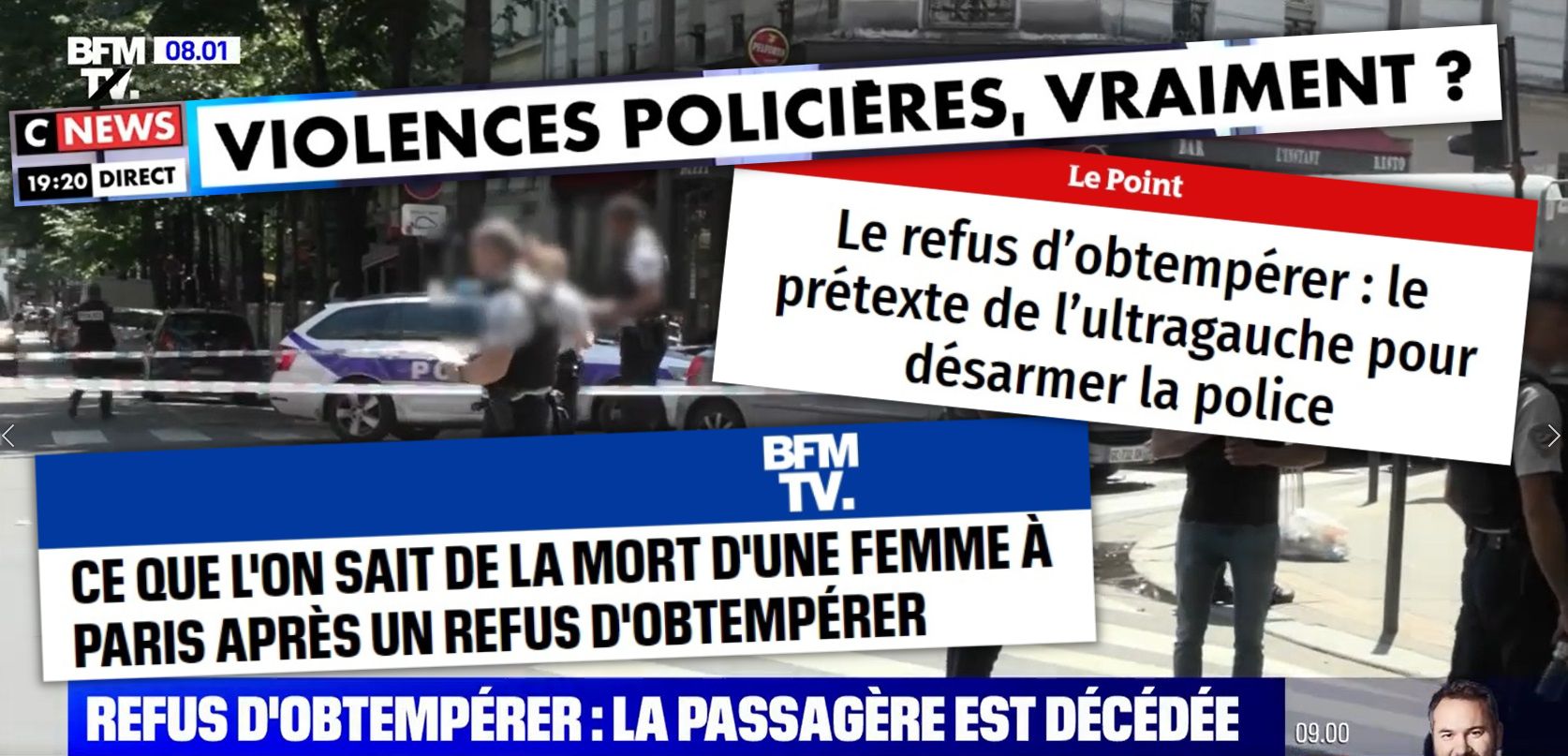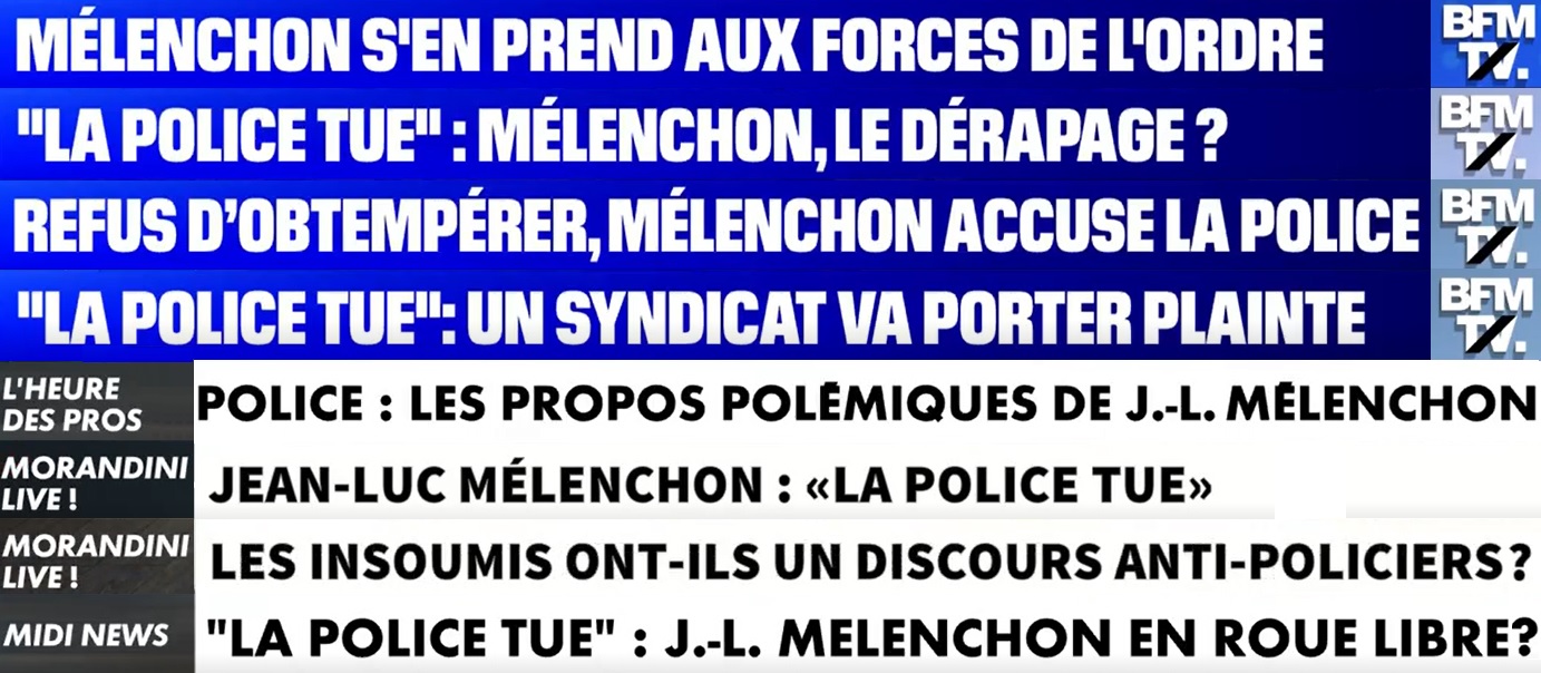 Encore un abus de pouvoir inacceptable. La peine de mort pour un refus d'obtempérer. Le préfet approuve ? Le ministre félicite ? La honte c'est quand ?", assumant de "créer la polémique pour qu'on parle du sujet". Mais au lieu de se concentrer sur ce fait avéré – la police a tué – les chaînes d'info constituent des plateaux d'experts pour débattre de la capacité de la police à tuer, et de celle de Mélenchon à provoquer. S'ils en profitent pour défendre la thèse de la légitime défense, les syndicalistes d'Alliance qui se relaient sur le plateau de BFMTV sont surtout invités pour répondre aux "attaques"