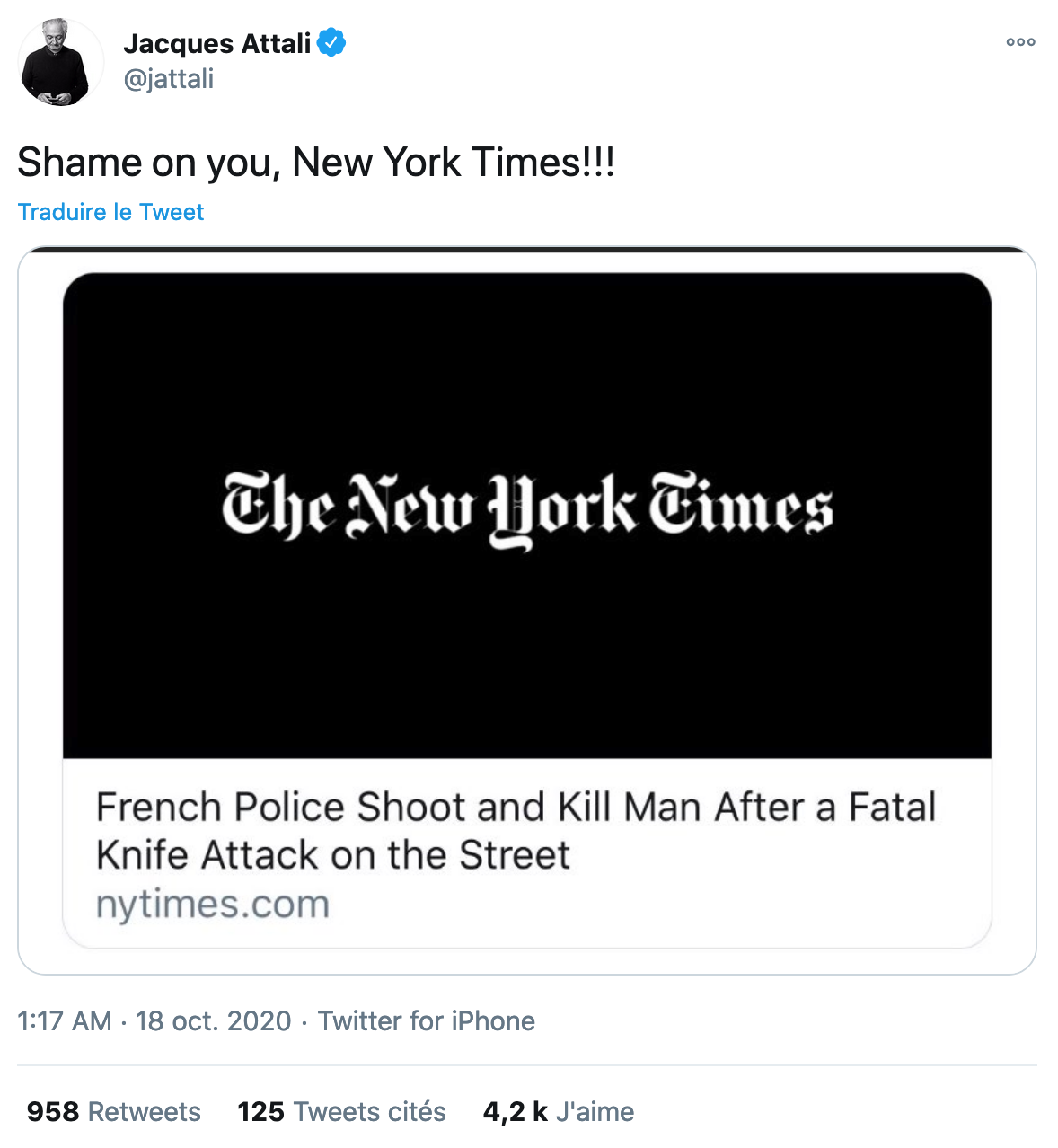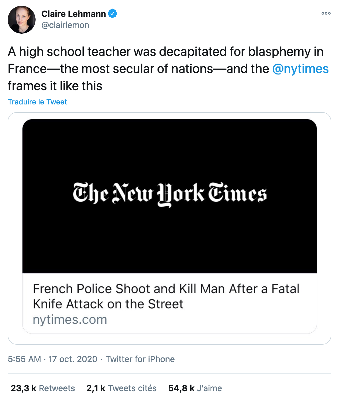 La tendance est donnée dès le premier article publié sur l'attaque par le New York Times. L'article, paru au soir du 16 octobre, quelques heures après l'assassinat de Samuel Paty, et qui relate de façon plutôt équilibrée ce qu'il est possible de savoir à ce moment-là, est titré d'un étrange "French Police Shoot and Kill Man After a Fatal Knife Attack on the Street", "La police française abat et tue un homme après une attaque fatale au couteau dans la rue". Vue comme ça, l'attaque ressemble à une bavure policière. Ce qui crée des réactions épidermiques, d'abord chez ceux pour qui les grands quotidiens américains représentent un contre-modèle. Claire Lehmann, la fondatrice du site australien et libertarien Quillette (on vous en parlait ici), ouvre le bal dans le monde anglo-saxon : "Un professeur de collège a été décapité pour blasphème en France - le pays le plus laïc de tous - et le New York Times le présente comme ça", décrit-elle dans un tweet reprenant le titre, partagé 25 000 fois.