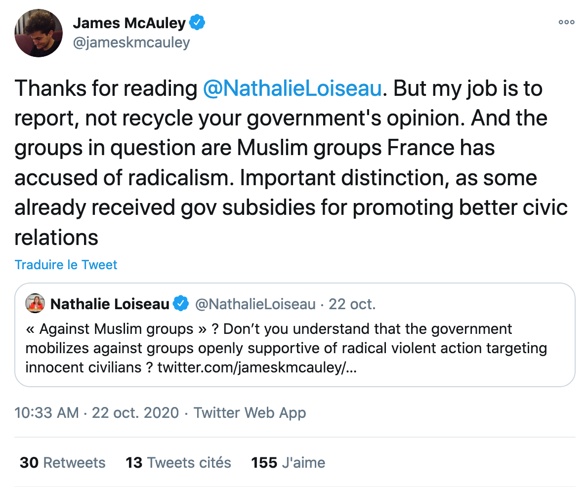 Jean-Pierre Denis, tandis que la polémiste et réalisatrice Caroline Fourest s'indigne, de même que l'eurodéputée LREM Nathalie Loiseau : "« Against Muslim groups » ? Don’t you understand that the government mobilizes against groups openly supportive of radical violent action targeting innocent civilians ?" / "« Against Muslim groups » ? Ne comprenez-vous pas que le gouvernement se mobilise contre des groupes qui soutiennent ouvertement des actions radicales et violentes contre des civils innocents ?" Ce à quoi le journaliste répond (en anglais) : "Merci de me lire, Nathalie Loiseau. Mais mon métier est de faire du journalisme, pas de recycler le point de vue de votre gouvernement. Et les groupes en question sont des groupes musulmans que la France a accusé d'être radicaux. Distinction importante, dans la mesure où certains ont déjà reçu des subventions gouvernementales pour leur travail de promotion de bonnes relations civiques."