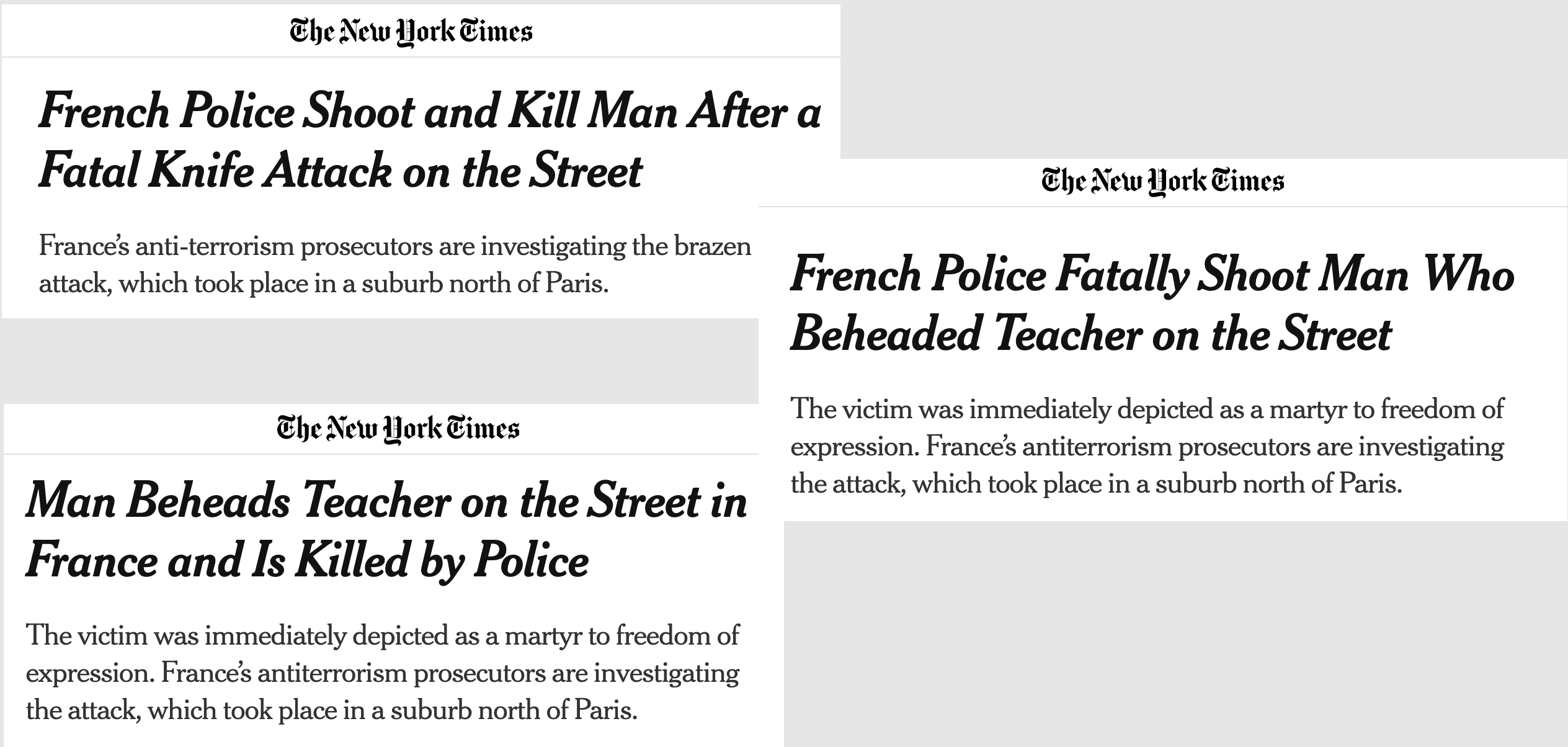 Ajout au 28 octobre : dans une réponse à la tribune publiée dans le Monde (visible sous les articles liés à la tribune), le New York Times a donné des précisions sur l'évolution du titre de l'article du 16 octobre, modifié trois fois : la modification qui précisait qu'il s'agissait d'une décapitation a eu lieu le soir-même à 21h48, selon le quotidien, qui donne des explications allant dans le sens de choix faits dans le cadre d'une couverture "live" de l'événement : "Cette modification suivait les vérifications que nous avons menées et qui nous ont permis de confirmer : 1) La nature de l’attaque. 2) La fonction de la victime". Ces informations sont cependant déjà citées dans la première version de l'article, sourçant "des sources officielles citées dans des médias français" confirmées par "un officier de police français" sous anonymat.