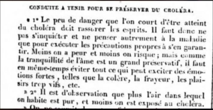 "Les mêmes attitudes collectives reparurent à Paris lors du choléra de 1832. Le jour de la mi-carême, Le Moniteur annonça la triste nouvelle de l'épidémie qui commençait. Mais on se refusa d'abord à croire ce journal trop officiel. H. Heine raconte : «Comme c'était le jour de la mi-carême, qu'il faisait beau soleil et un temps charmant, les Parisiens se trémoussaient avec d'autant plus de jovialité sur les boulevards où l'on aperçut même des masques qui, parodiant la couleur maladive et la figure défaite, raillaient la crainte du choléra et la maladie elle-même. Le soir du même jour, les bals publics furent plus fréquentés que jamais» (…) A Lille, la même année, la population lilloise refusa de croire à l'approche du choléra. Elle la considéra dans un premier temps comme une invention de la police. On constate donc, dans le temps et dans l'espace, une sorte d'unanimité dans le refus de mots regardés comme tabous. On évitait de les prononcer. Ou, si on le faisait au début d'une épidémie, c'était dans une locution négative et rassurante telle que «ce n'est pas la peste à proprement parler». Nommer le mal, c'eût été l'attirer et abattre l'ultime rempart qui le tenait en respect."