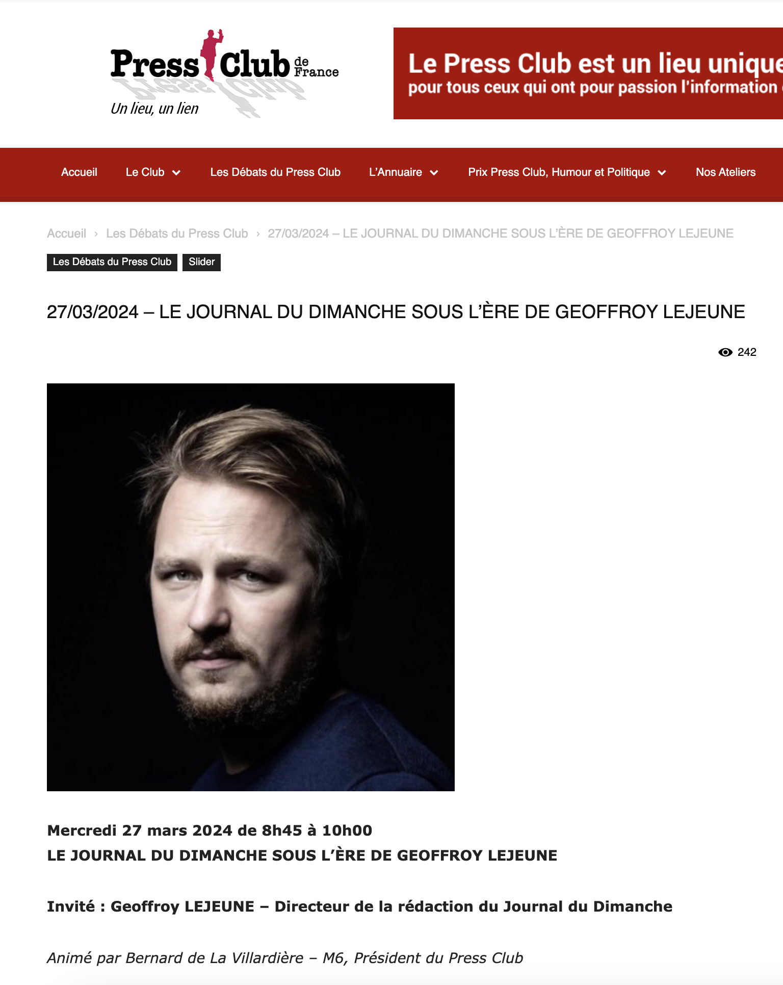Ce 27 mars, au 5e étage de la tour du groupe hôtelier Accor, à Issy-les-Moulineaux (Hauts-de-Seine), était organisée une rencontre entre les deux journalistes, à l'initiative du Press Club de France. Le thème de la rencontre : "Le Journal du Dimanche sous l'ère de Geoffroy Lejeune".