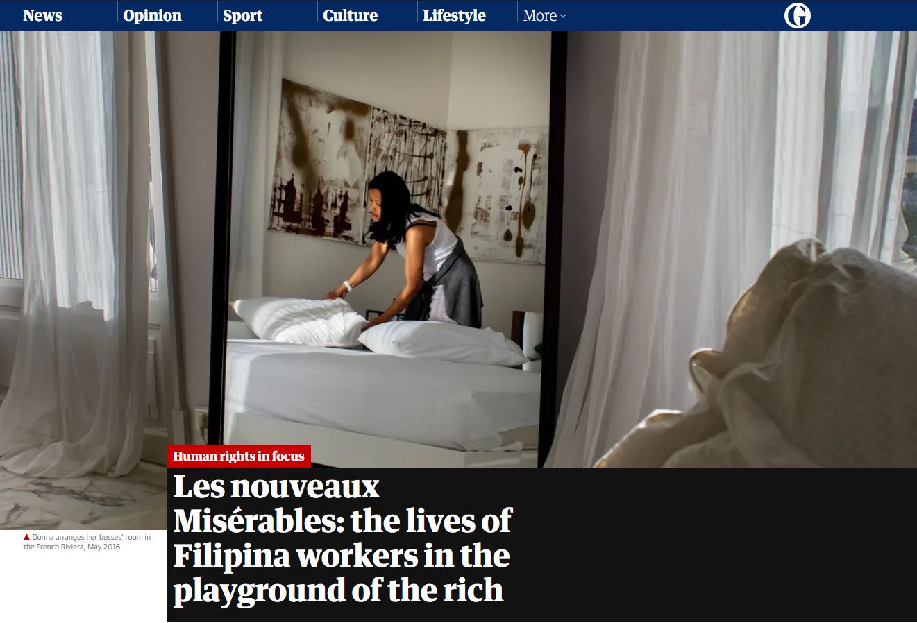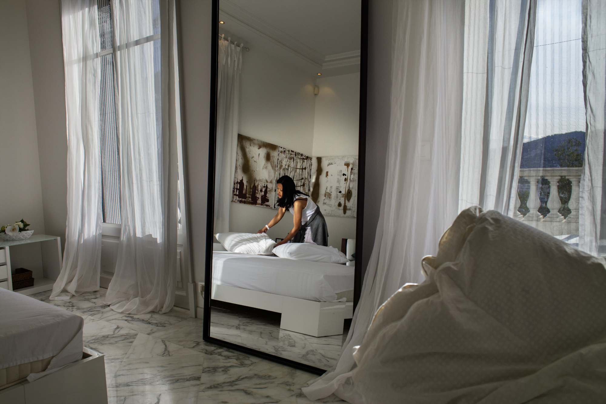 "Nous sommes en mai 2016. Donna prépare la chambre de ses patrons libyens, dans leur villa sur les hauteurs de Cannes. Ils ont aussi un appartement avenue Foch à Paris, elle navigue entre les deux. Nous sommes venus tous les deux en train, je suis là incognito, et les patrons assurent qu'ils arrivent incessamment, et que la maison doit être parfaite. Mais ils n'arrivent pas. Ma présence l'arrange parce qu'elle se sent seule dans la grande villa ; elle me permet de prendre des photos parce qu'ils ont désactivé les caméras de surveillance, suite à une baisse de leurs revenus. Son salaire est correct, par exemple, cet été-là, 2000 euros pour une période d'un mois et demi. Mais il est versé de manière aléatoire, elle n'a pas d'horaires, elle n'est pas déclarée, elle est à la merci des caprices et du harcèlement de ses patrons."