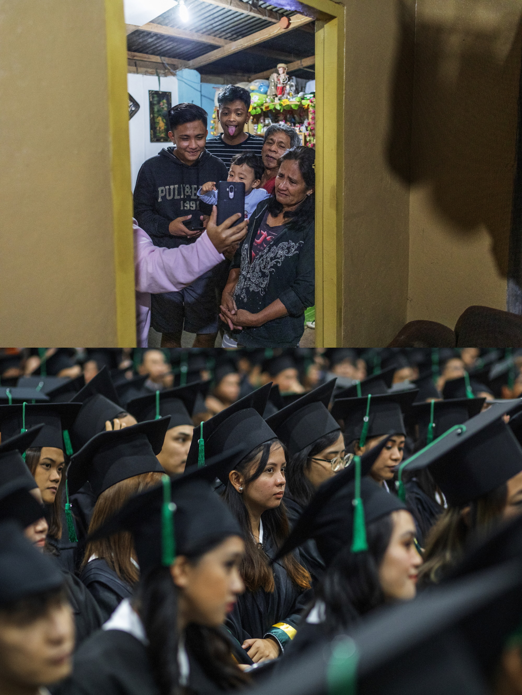 "Août 2019 : dans leur petit village des Philippines, la famille de Donna s'est rassemblée près de la porte, là où le wifi passe, pour lui parler par WhatsApp. Je prends la photo, j'habite chez eux depuis plusieurs jours et je me fais tout petit. Ils habitent une maison en tôles et vivent d'une petite exploitation de café et de fleurs. La photo révèle les différences d'états d'âme : les ados sont heureux de voir le visage de leur mère, mais sa maman pleure. Elle sait ce que sa fille endure, elle a été employée de maison elle aussi, à Taïwan... Jhen, l'autre employée que je photographie, m'avait dit : « Si tu veux comprendre, tu dois aller dans nos familles ». Pour financer le voyage, j'ai postulé au prix Camille-Lepage avec une première série de photos, et j'ai gagné. Je voulais partir avec elles pour photographier des retrouvailles après des années d'absence, mais elles ne peuvent pas : il faudrait de nouveau payer un passeur pour retourner en France, où elles veulent continuer de travailler pour financer les études de leurs enfants. C'est donc moi qui vais voir leurs enfants, leurs maris, sans elles... Mais je rapporte des Philippines une photo qui rend Donna très heureuse : la cérémonie de remise du diplôme d'infirmière de sa fille. Je me suis battu pour y assister, je n'avais pas l'autorisation nécessaire, mais c'était mon but ultime."