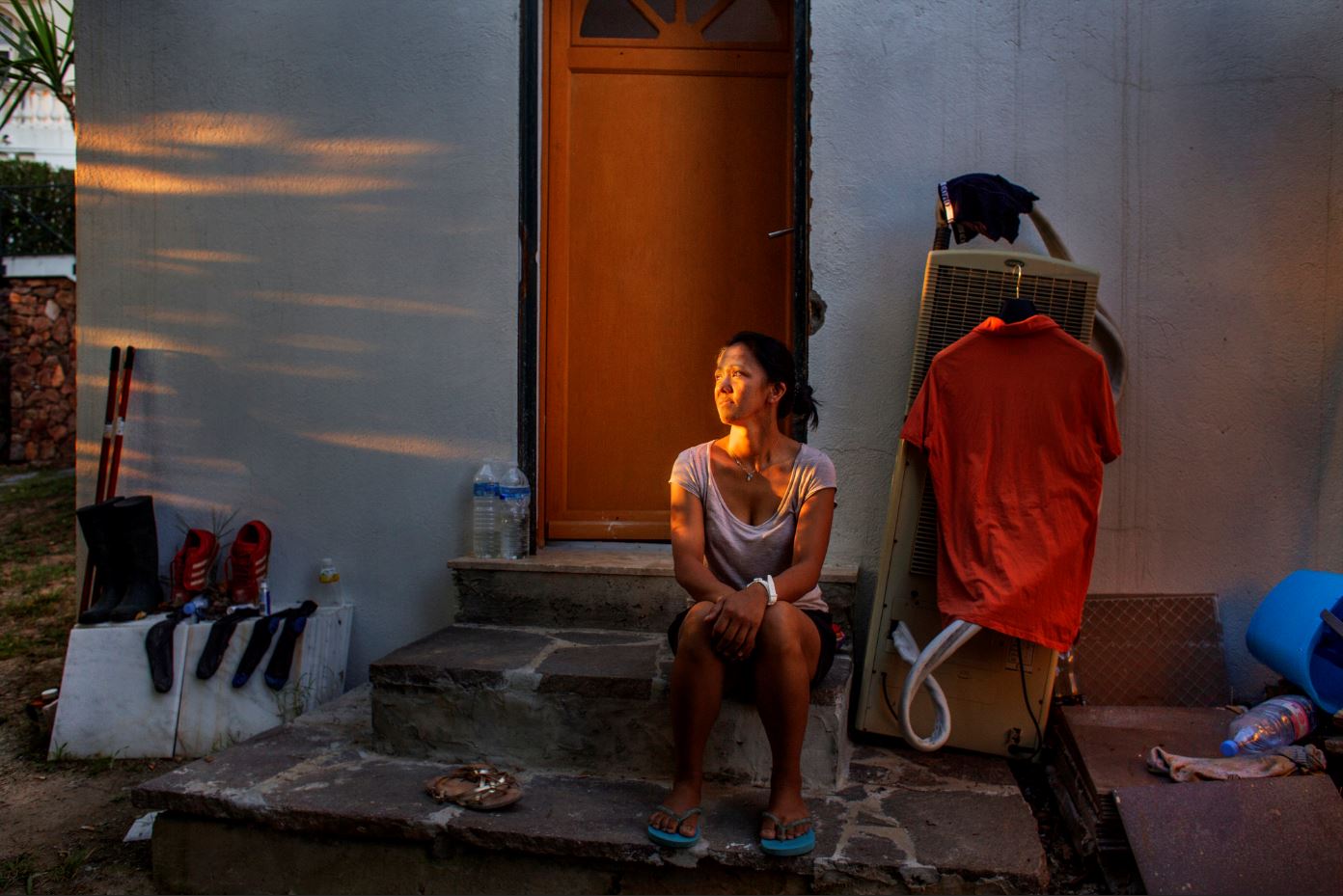 "Août 2016. Nous sommes de nouveau dans la villa à Cannes. Donna regarde la lumière du soir sur les marches du petit logement des employés, sous la piscine. Cette fois-ci, je suis là officiellement : j'ai été embauché comme homme de ménage, pour seconder Donna. Quand ils comprennent que je suis français, ils s'inquiètent sans doute de ce que je pourrais raconter sur leur domesticité sans papiers et au noir, mais c'est trop tard, je suis déjà au travail aux côtés de Donna, d'une nounou également philippine et de jardinier, chauffeur, et électricien maghrébins. Au début, je ne fais pas de photos, je planque mon appareil dans la chambre, j'attends d'avoir la confiance de tous les employés, qu'ils ne me dénoncent pas, moi ou Donna. J'observe aussi les allées et venues de la famille, pour évaluer les laps de temps pendant lesquels je pourrai faire des photos. Je suis stressé, j'ai peur que ça cause des problèmes à Donna. Et puis je finis par sortir l'appareil, un petit Canon semi-professionnel, discret. Ce lieu clos, sans loi, je veux le documenter. L'ambiance est très dure. On n'a pas d'horaires, on est accusés de voler de la nourriture, la patronne fait des caprices : la couleur de l'eau de la piscine ne lui plaît pas, il faut tout vider, ou bien elle renverse exprès des plats dans la cuisine pour que nous ayons tout à nettoyer, et du coup on est en retard pour nettoyer les chambres, etc."