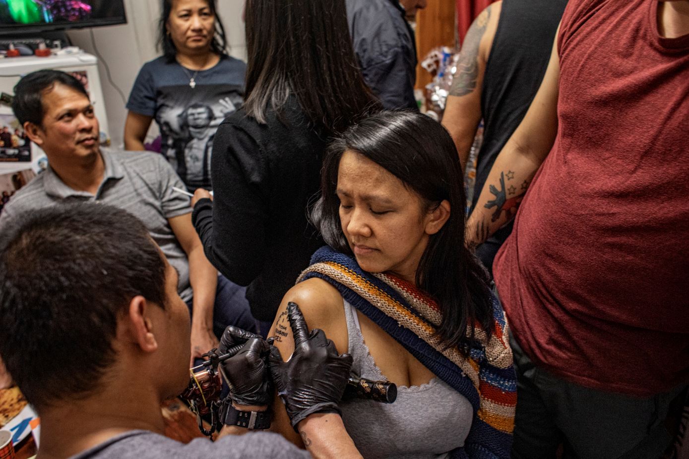 "Février 2020 : à Saint-Ouen, lors d'une réunion de la communauté philippine, Donna se fait tatouer parce qu'elle est devenue vice-présidente du "brotherhood", la confrérie, une association de solidarité informelle. Parce que je les fréquente depuis 2015, ils m'ont proposé d'en devenir membre moi aussi, j'ai accepté parce que je voulais payer une cotisation : je viens souvent, je profite des repas... J'ai passé quelques épreuves, du genre avoir les yeux bandés et accepter de tomber sans savoir qui va vous retenir (pour éprouver le niveau de confiance), réciter un texte en philippin..."