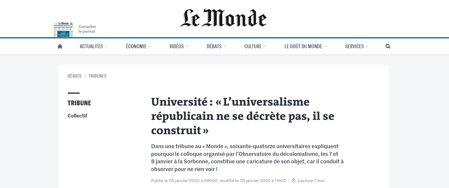 n'apparaissent en fait pas dans la tribune du collectif de 74 universitaires, publiée le 5 janvier 2022 dans le journal du soir. L'expression était en fait apparue sur Twitter, où s'étaient élevées les voix d'universitaires et de militant·es opposé·es au colloque. Le texte publié dans le Monde constatait que "les animateurs des tables rondes sont les intervenants et vice-versa, et la quasi-totalité d'entre eux membres de l'Observatoire [du décolonialisme]"