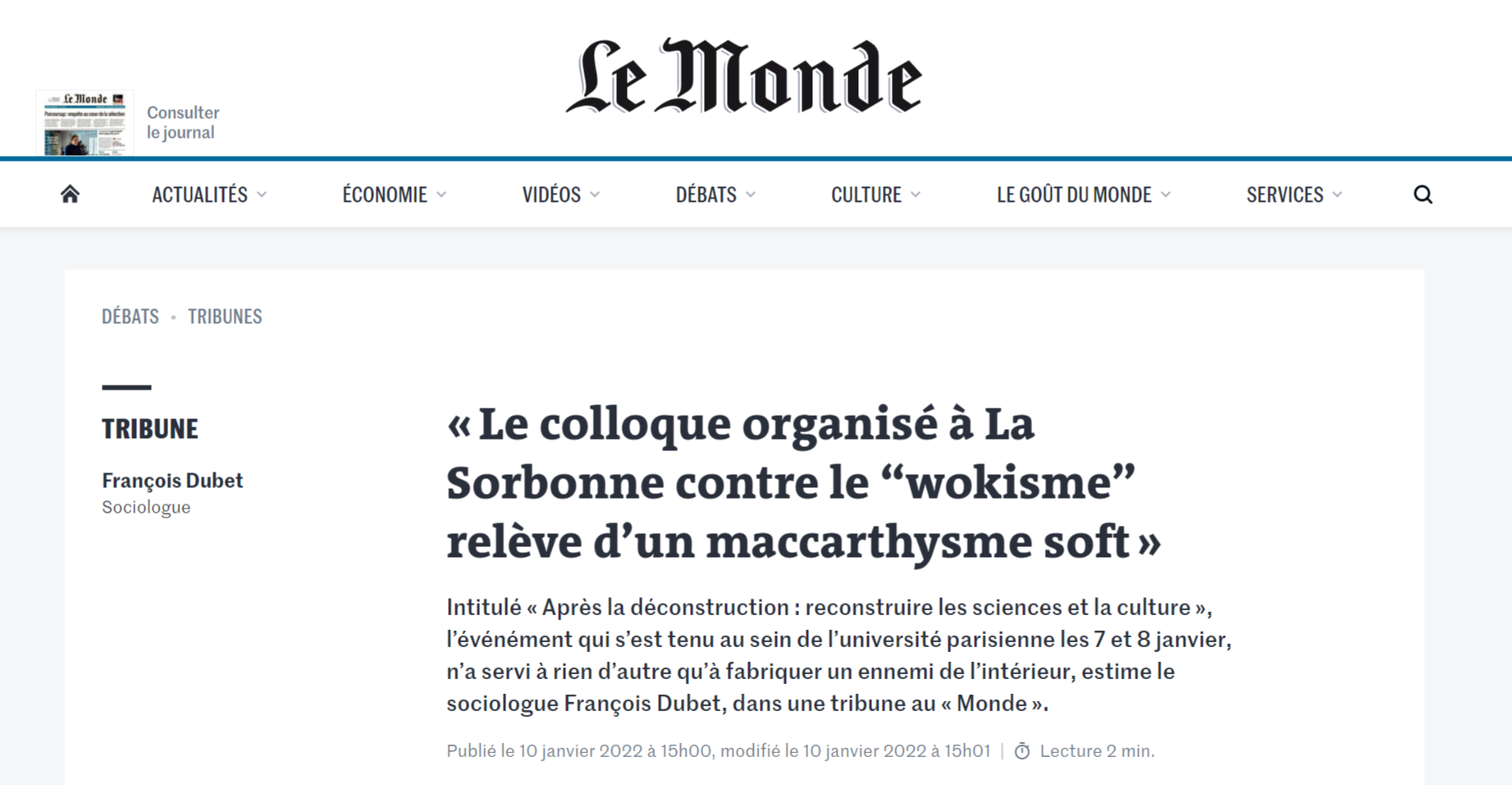 n'apparaissent pas non plus dans une autre tribune du Monde, publiée le 10 janvier 2022. Signée du sociologue François Dubet, elle dénonçait, à travers l'organisation de ce colloque, "un maccarthysme soft visant à désigner les ennemis de l'intérieur, leurs complices, leurs compagnons de route et leurs victimes"