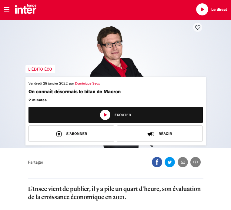 s, se montre guilleret lors de sa chronique dans la matinale de France inter. L'Insee vient de publier ses indicateurs macro-économiques pour l'année 2021, et le journaliste n'est pas loin de sabrer le champagne : "La croissance, depuis le début du quinquennat et malgré le Covid, a progressé de pas loin de 5% sur les quatre années et demi qui se sont écoulées depuis l’élection d’Emmanuel Macron." Niveau emploi, il y a de quoi être heureux aussi : "Depuis 2017, poursuit Seux, le nombre de demandeurs d’emploi qui ne travaillent pas du tout a reculé de près de 400 000 et un million d’emplois ont été créés. Pas mal !" "
