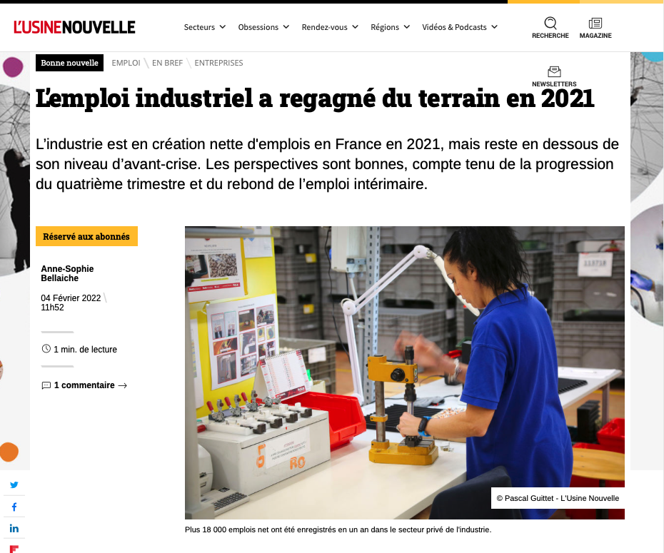 e nouvelle, "l’industrie est en création nette d'emplois en France en 2021", même si le nombre d'emplois du secteur "reste en dessous de son niveau d’avant-crise". Felicia Sideris et Caroline Quevrain, de TF1, ne sont pas tendres sur ce point avec le président de la République. Pour elles, son constat est "doublement trompeur". "Certes, avec une augmentation de 1,3% en un an selon les chiffres de l'Insee, la France a effectivement créé de très nombreux emplois industriels. Sauf que, sur l'ensemble du mandat, les chiffres de l'institut montrent que l'emploi dans ce secteur est en baisse. Entre 2017 et 2021, la France a perdu 16 600 emplois industriels."