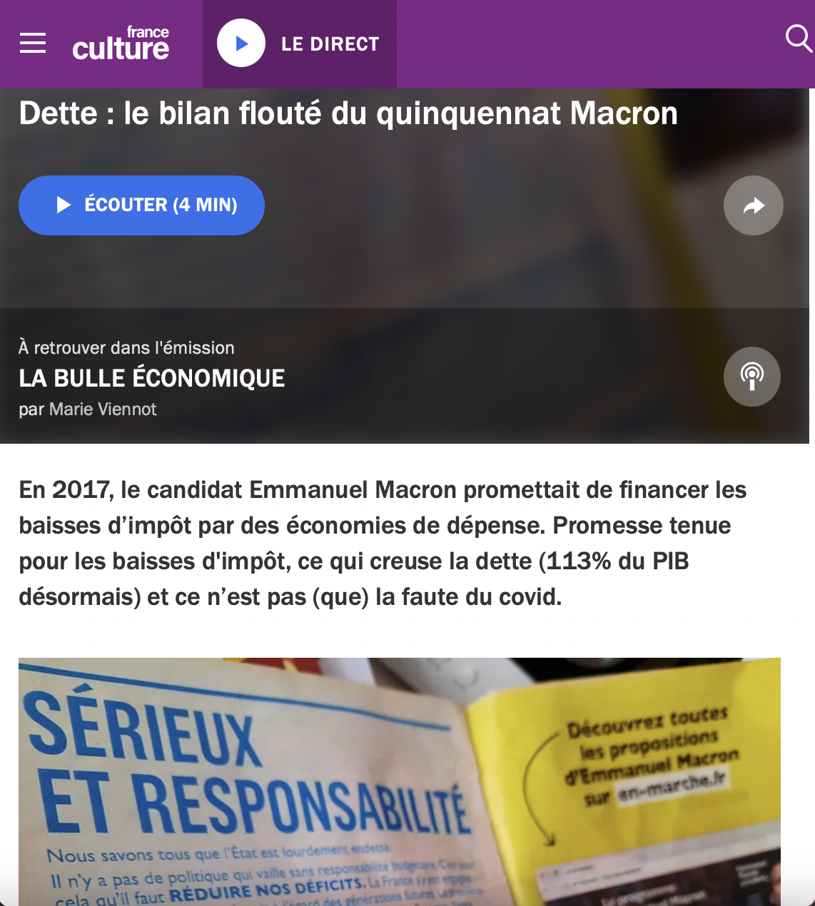 , Macron revendique ainsi ses réussites sur le plan économique : "[...] Grâce aux réformes menées, notre industrie a pour la première fois recréé des emplois et le chômage a atteint son plus bas niveau depuis quinze ans. Grâce au travail de tous, nous avons pu investir dans nos hôpitaux et notre recherche, renforcer nos armées, recruter policiers, gendarmes, magistrats et enseignants, réduire notre dépendance aux énergies fossiles, continuer à moderniser notre agriculture. Grâce à nos efforts, nous avons, avant la pandémie, réduit nos déficits et, tout au long du quinquennat, baissé les impôts de manière inédite [...]"