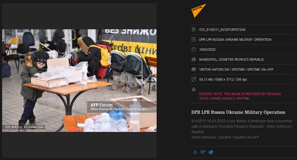 Plus gênant que des photos de propagande de Vladimir Poutine, les légendes des clichés en provenance de Sputnik à propos de l'invasion de l'Ukraine par la Russie. Pardon : de "l'opération militaire", est-il écrit par Sputnik dans les légendes des photos accessibles sur AFP Forum. Leur présentation des faits épouse en effet la ligne officielle russe, jusqu'à l'absurde : si la Crimée, annexée par la force en 2014, est systématiquement décrite comme faisant partie de la Russie, le 16 mars, Sputnik présente même Marioupol, assiégée par l'armée russe, comme une ville de la "République populaire de Donetsk", d'après le nom d'une des deux enclaves séparatistes officiellement reconnues par Moscou juste avant l'entrée en guerre.