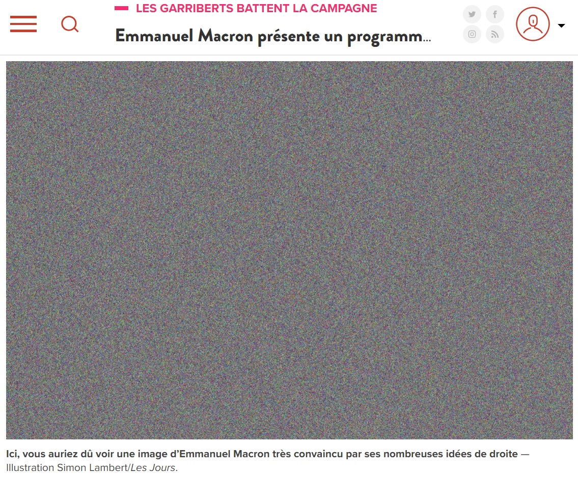 Quand l'équipe de campagne d'Emmanuel Macron choisit un nombre limité de photojournalistes pour couvrir sa conférence de presse de candidature, le 17 mars, les Jours, média indépendant privé de ses photos, décide de marquer le coup en utilisant des "images aveugles" dans un article "écrit dans les volutes de fumée de nos naseaux", introduisent Raphaël Garrigos et Isabelle Roberts. Ils le font aussi savoir sur Twitter.
