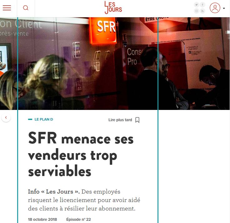 C'est une enquête accablante sur les méthodes de l'un des principaux opérateurs mobiles. On y découvre comment la direction de SFR fait tout pour stopper l'hémorragie de désabonnements, à commencer par interdire à ses vendeurs d'aider les clients à résilier leur forfait... Cette enquête, on la doit au site Les Jours. Dans un long article publié vendredi dernier, la journaliste Alice Géraud révèle comment des vendeurs risquent aujourd'hui le licenciement pour avoir simplement indiqué à des clients mécontents comment mettre fin à leur abonnement.